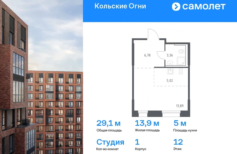 Предлагается квартира студия комфорт-класса 29,05 кв.м в корпусе 1 на 12 этаже, в ЖК «Кольские Огни» Квартира без отделки. Доступность опции "отделка" и возможность комплектации мебелью и декором уточняйте у застройщика. Приобрести квартиру возможно по специальным акциям от застройщика, с текущими условиями акций можно ознакомиться в блоке “Акций”. Цена динамическая и может отличаться, уточняйте актуальность у застройщика. Жилой комплекс «Кольские Огни» будет построен в Мурманской области, в городе Кола. Путь до центра Мурманска будет быстрым — всего 25 минут на машине. Рядом — Поморская набережная, парк, тундровый сад и лес всего в 10 минутах пешком. На первых этажах домов откроются кофейни и магазины, фитнес-зал и салон красоты, аптека, пункты выдачи заказов. Рядом с жилым комплексом работают детский сад, спортивная школа с бассейном и ФОК. Во дворе — озеленение, спортивные площадки, ремонт велосипедов, догхабы. Еще на территории квартала построим паркинг с зарядкой для электромобилей. Корпуса высотой 9–12 этажей и 14–17-этажные башни украшают деревянные панели. На входе в подъезды не будет ступеней и высоких порогов. После прогулки велосипеды и коляски можно оставить в местах хранения. Продуманные планировки от небольших студий до просторных 4-комнатных квартир. Отделка на выбор: готовая, White Box или вариант без нее. Выбирайте варианты без отделки, если хотите реализовать собственные решения.#yan19-2r1669115#О застройщике