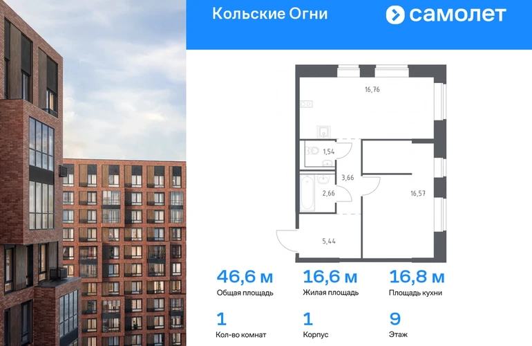 Строим кварталы для жизни с заботой о будущем. Предлагается 1-комнатная квартира комфорт-класса 46,63 кв.м в корпусе 1 на 9 этаже, в ЖК «Кольские Огни» Квартира без отделки. Доступность опции «отделка» и возможность комплектации мебелью и декором уточняйте у застройщика. Приобрести квартиру возможно по специальным акциям от застройщика, с текущими условиями акций можно ознакомиться в блоке «Акций». Цена динамическая и может отличаться, уточняйте актуальность у застройщика. Жилой комплекс «Кольские Огни» будет построен в Мурманской области, в городе Кола. Путь до центра Мурманска будет быстрым — всего 25 минут на машине. Рядом — Поморская набережная, парк, тундровый сад и лес всего в 10 минутах пешком. На первых этажах домов откроются кофейни и магазины, фитнес-зал и салон красоты, аптека, пункты выдачи заказов. Рядом с жилым комплексом работают детский сад, спортивная школа с бассейном и ФОК. Во дворе — озеленение, спортивные площадки, ремонт велосипедов, догхабы. Еще на территории квартала построим паркинг с зарядкой для электромобилей. Корпуса высотой 9–12 этажей и 14–17-этажные башни украшают деревянные панели. На входе в подъезды не будет ступеней и высоких порогов. После прогулки велосипеды и коляски можно оставить в местах хранения. Продуманные планировки от небольших студий до просторных 4-комнатных квартир. Отделка на выбор: готовая, White Box или вариант без нее. Выбирайте варианты без отделки, если хотите реализовать собственные решения.#yan19-2r1672163#О застройщике