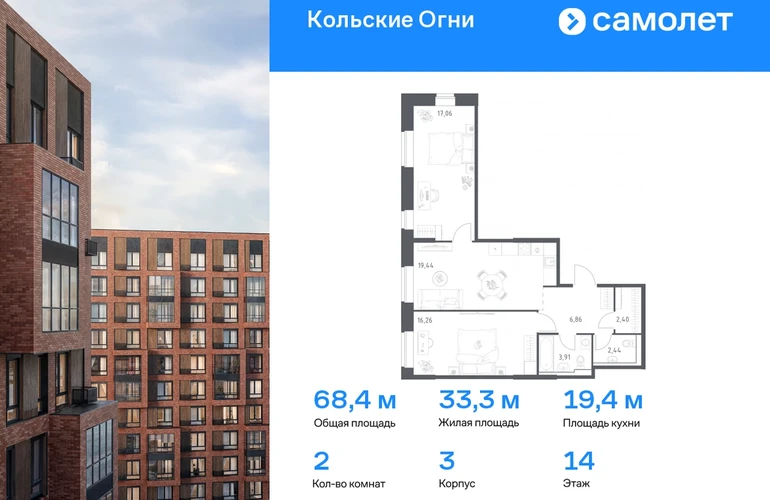 Предлагается 2-комнатная квартира комфорт-класса 68,37 кв.м в корпусе 3 на 14 этаже, в ЖК «Кольские Огни» Квартира без отделки. Доступность опции «отделка» и возможность комплектации мебелью и декором уточняйте у застройщика. Приобрести квартиру возможно по специальным акциям от застройщика, с текущими условиями акций можно ознакомиться в блоке «Акций». Цена динамическая и может отличаться, уточняйте актуальность у застройщика. Жилой комплекс «Кольские Огни» будет построен в Мурманской области, в городе Кола. Путь до центра Мурманска будет быстрым — всего 25 минут на машине. Рядом — Поморская набережная, парк, тундровый сад и лес всего в 10 минутах пешком. На первых этажах домов откроются кофейни и магазины, фитнес-зал и салон красоты, аптека, пункты выдачи заказов. Рядом с жилым комплексом работают детский сад, спортивная школа с бассейном и ФОК. Во дворе — озеленение, спортивные площадки, ремонт велосипедов, догхабы. Еще на территории квартала построим паркинг с зарядкой для электромобилей. Корпуса высотой 9–12 этажей и 14–17-этажные башни украшают деревянные панели. На входе в подъезды не будет ступеней и высоких порогов. После прогулки велосипеды и коляски можно оставить в местах хранения. Продуманные планировки от небольших студий до просторных 4-комнатных квартир. Отделка на выбор: готовая, White Box или вариант без нее. Выбирайте варианты без отделки, если хотите реализовать собственные решения.#yan19-2r1684234#О застройщике