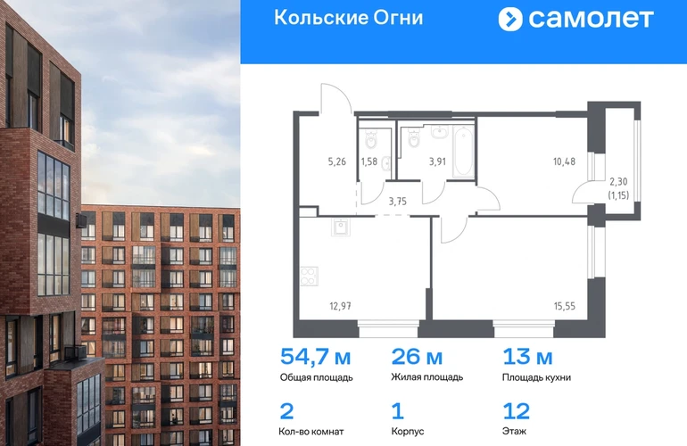 Строим кварталы для жизни с заботой о будущем. Предлагается 2-комнатная квартира комфорт-класса 54,65 кв.м в корпусе 1 на 12 этаже, в ЖК «Кольские Огни» Квартира без отделки. Доступность опции «отделка» и возможность комплектации мебелью и декором уточняйте у застройщика. Приобрести квартиру возможно по специальным акциям от застройщика, с текущими условиями акций можно ознакомиться в блоке «Акций». Цена динамическая и может отличаться, уточняйте актуальность у застройщика. Жилой комплекс «Кольские Огни» будет построен в Мурманской области, в городе Кола. Путь до центра Мурманска будет быстрым — всего 25 минут на машине. Рядом — Поморская набережная, парк, тундровый сад и лес всего в 10 минутах пешком. На первых этажах домов откроются кофейни и магазины, фитнес-зал и салон красоты, аптека, пункты выдачи заказов. Рядом с жилым комплексом работают детский сад, спортивная школа с бассейном и ФОК. Во дворе — озеленение, спортивные площадки, ремонт велосипедов, догхабы. Еще на территории квартала построим паркинг с зарядкой для электромобилей. Корпуса высотой 9–12 этажей и 14–17-этажные башни украшают деревянные панели. На входе в подъезды не будет ступеней и высоких порогов. После прогулки велосипеды и коляски можно оставить в местах хранения. Продуманные планировки от небольших студий до просторных 4-комнатных квартир. Отделка на выбор: готовая, White Box или вариант без нее. Выбирайте варианты без отделки, если хотите реализовать собственные решения.#yan19-2r1691966#О застройщике