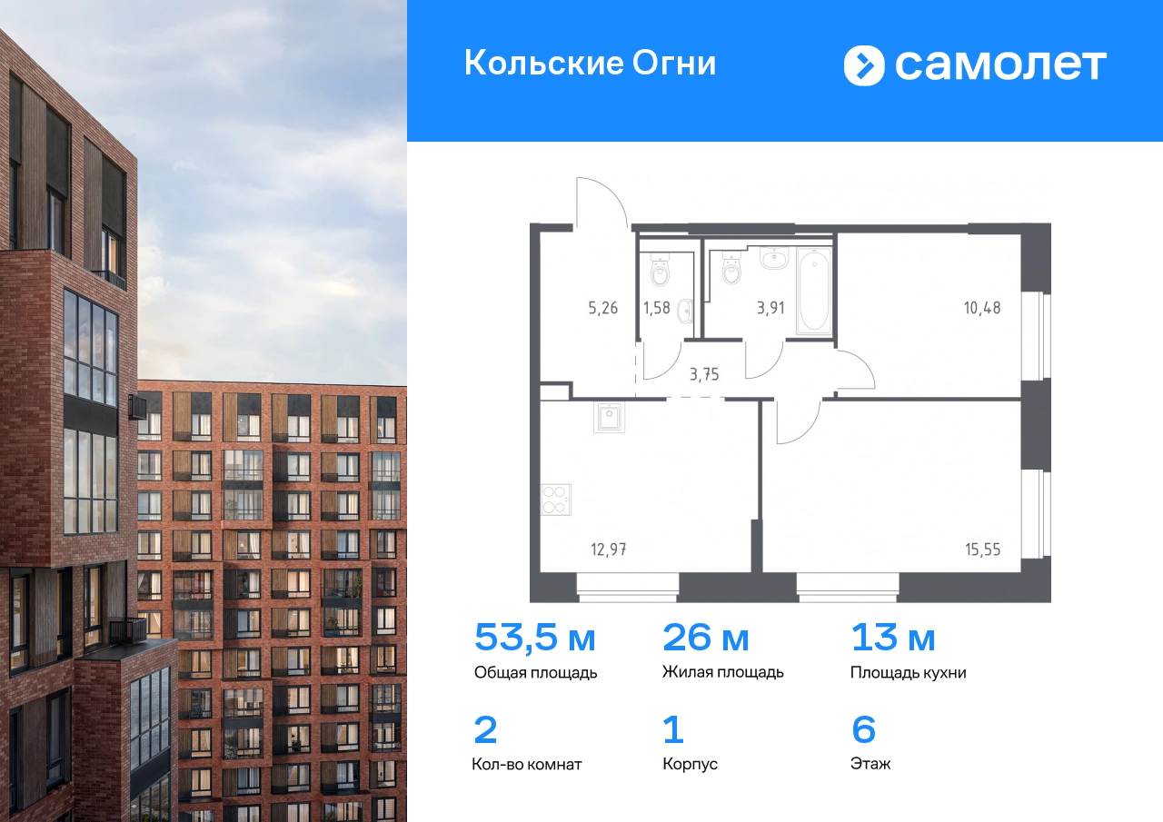 Строим кварталы для жизни с заботой о будущем. Предлагается 2-комнатная квартира комфорт-класса 53,5 кв.м в корпусе 1 на 6 этаже, в ЖК «Кольские Огни» Квартира без отделки. Доступность опции «отделка» и возможность комплектации мебелью и декором уточняйте у застройщика. Приобрести квартиру возможно по специальным акциям от застройщика, с текущими условиями акций можно ознакомиться в блоке «Акций». Цена динамическая и может отличаться, уточняйте актуальность у застройщика. Жилой комплекс «Кольские Огни» будет построен в Мурманской области, в городе Кола. Путь до центра Мурманска будет быстрым — всего 25 минут на машине. Рядом — Поморская набережная, парк, тундровый сад и лес всего в 10 минутах пешком. На первых этажах домов откроются кофейни и магазины, фитнес-зал и салон красоты, аптека, пункты выдачи заказов. Рядом с жилым комплексом работают детский сад, спортивная школа с бассейном и ФОК. Во дворе — озеленение, спортивные площадки, ремонт велосипедов, догхабы. Еще на территории квартала построим паркинг с зарядкой для электромобилей. Корпуса высотой 9–12 этажей и 14–17-этажные башни украшают деревянные панели. На входе в подъезды не будет ступеней и высоких порогов. После прогулки велосипеды и коляски можно оставить в местах хранения. Продуманные планировки от небольших студий до просторных 4-комнатных квартир. Отделка на выбор: готовая, White Box или вариант без нее. Выбирайте варианты без отделки, если хотите реализовать собственные решения.#yan19-2r1706690#О застройщике