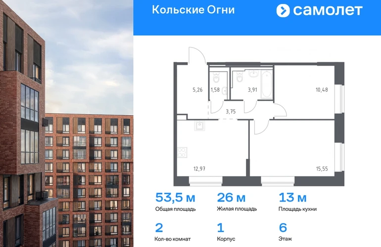 Строим кварталы для жизни с заботой о будущем. Предлагается 2-комнатная квартира комфорт-класса 53,5 кв.м в корпусе 1 на 6 этаже, в ЖК «Кольские Огни» Квартира без отделки. Доступность опции «отделка» и возможность комплектации мебелью и декором уточняйте у застройщика. Приобрести квартиру возможно по специальным акциям от застройщика, с текущими условиями акций можно ознакомиться в блоке «Акций». Цена динамическая и может отличаться, уточняйте актуальность у застройщика. Жилой комплекс «Кольские Огни» будет построен в Мурманской области, в городе Кола. Путь до центра Мурманска будет быстрым — всего 25 минут на машине. Рядом — Поморская набережная, парк, тундровый сад и лес всего в 10 минутах пешком. На первых этажах домов откроются кофейни и магазины, фитнес-зал и салон красоты, аптека, пункты выдачи заказов. Рядом с жилым комплексом работают детский сад, спортивная школа с бассейном и ФОК. Во дворе — озеленение, спортивные площадки, ремонт велосипедов, догхабы. Еще на территории квартала построим паркинг с зарядкой для электромобилей. Корпуса высотой 9–12 этажей и 14–17-этажные башни украшают деревянные панели. На входе в подъезды не будет ступеней и высоких порогов. После прогулки велосипеды и коляски можно оставить в местах хранения. Продуманные планировки от небольших студий до просторных 4-комнатных квартир. Отделка на выбор: готовая, White Box или вариант без нее. Выбирайте варианты без отделки, если хотите реализовать собственные решения.#yan19-2r1706690#О застройщике