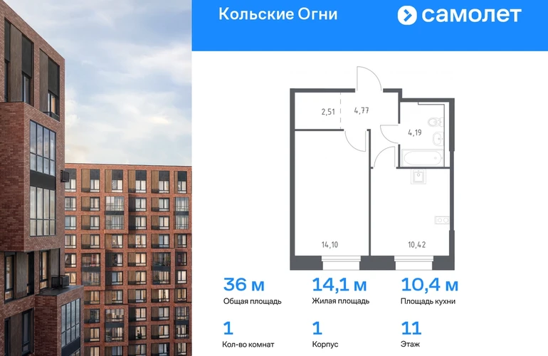 Строим кварталы для жизни с заботой о будущем. Предлагается 1-комнатная квартира комфорт-класса 35,99 кв.м в корпусе 1 на 11 этаже, в ЖК «Кольские Огни» Квартира без отделки. Доступность опции «отделка» и возможность комплектации мебелью и декором уточняйте у застройщика. Приобрести квартиру возможно по специальным акциям от застройщика, с текущими условиями акций можно ознакомиться в блоке «Акций». Цена динамическая и может отличаться, уточняйте актуальность у застройщика. Жилой комплекс «Кольские Огни» будет построен в Мурманской области, в городе Кола. Путь до центра Мурманска будет быстрым — всего 25 минут на машине. Рядом — Поморская набережная, парк, тундровый сад и лес всего в 10 минутах пешком. На первых этажах домов откроются кофейни и магазины, фитнес-зал и салон красоты, аптека, пункты выдачи заказов. Рядом с жилым комплексом работают детский сад, спортивная школа с бассейном и ФОК. Во дворе — озеленение, спортивные площадки, ремонт велосипедов, догхабы. Еще на территории квартала построим паркинг с зарядкой для электромобилей. Корпуса высотой 9–12 этажей и 14–17-этажные башни украшают деревянные панели. На входе в подъезды не будет ступеней и высоких порогов. После прогулки велосипеды и коляски можно оставить в местах хранения. Продуманные планировки от небольших студий до просторных 4-комнатных квартир. Отделка на выбор: готовая, White Box или вариант без нее. Выбирайте варианты без отделки, если хотите реализовать собственные решения.#yan19-2r1706699#О застройщике