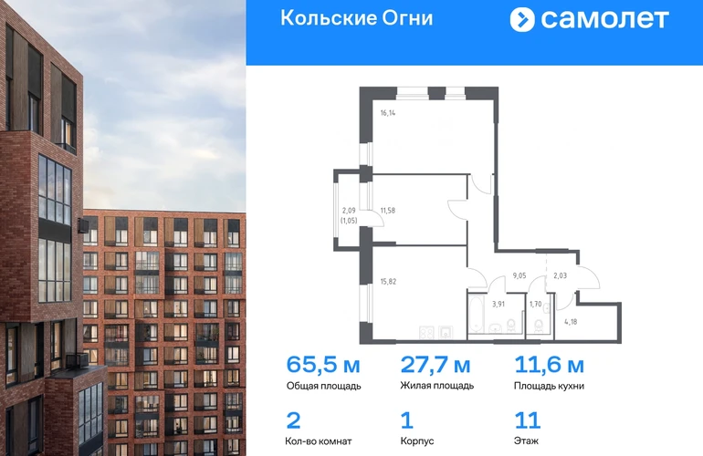 Строим кварталы для жизни с заботой о будущем. Предлагается 2-комнатная квартира комфорт-класса 65,46 кв.м в корпусе 1 на 11 этаже, в ЖК «Кольские Огни» Квартира без отделки. Доступность опции «отделка» и возможность комплектации мебелью и декором уточняйте у застройщика. Приобрести квартиру возможно по специальным акциям от застройщика, с текущими условиями акций можно ознакомиться в блоке «Акций». Цена динамическая и может отличаться, уточняйте актуальность у застройщика. Жилой комплекс «Кольские Огни» будет построен в Мурманской области, в городе Кола. Путь до центра Мурманска будет быстрым — всего 25 минут на машине. Рядом — Поморская набережная, парк, тундровый сад и лес всего в 10 минутах пешком. На первых этажах домов откроются кофейни и магазины, фитнес-зал и салон красоты, аптека, пункты выдачи заказов. Рядом с жилым комплексом работают детский сад, спортивная школа с бассейном и ФОК. Во дворе — озеленение, спортивные площадки, ремонт велосипедов, догхабы. Еще на территории квартала построим паркинг с зарядкой для электромобилей. Корпуса высотой 9–12 этажей и 14–17-этажные башни украшают деревянные панели. На входе в подъезды не будет ступеней и высоких порогов. После прогулки велосипеды и коляски можно оставить в местах хранения. Продуманные планировки от небольших студий до просторных 4-комнатных квартир. Отделка на выбор: готовая, White Box или вариант без нее. Выбирайте варианты без отделки, если хотите реализовать собственные решения.#yan19-2r1706706#О застройщике