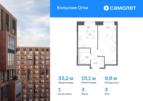 Предлагается 1-комнатная квартира комфорт-класса 33,2 кв.м в корпусе 3 на 3 этаже, в ЖК «Кольские Огни» Квартира без отделки. Доступность опции "отделка" и возможность комплектации мебелью и декором уточняйте у застройщика. Приобрести квартиру возможно по специальным акциям от застройщика, с текущими условиями акций можно ознакомиться в блоке “Акций”. Цена динамическая и может отличаться, уточняйте актуальность у застройщика. Жилой комплекс «Кольские Огни» будет построен в Мурманской области, в городе Кола. Путь до центра Мурманска будет быстрым — всего 25 минут на машине. Рядом — Поморская набережная, парк, тундровый сад и лес всего в 10 минутах пешком. На первых этажах домов откроются кофейни и магазины, фитнес-зал и салон красоты, аптека, пункты выдачи заказов. Рядом с жилым комплексом работают детский сад, спортивная школа с бассейном и ФОК. Во дворе — озеленение, спортивные площадки, ремонт велосипедов, догхабы. Еще на территории квартала построим паркинг с зарядкой для электромобилей. Корпуса высотой 9-12 этажей и 14-17-этажные башни украшают деревянные панели. На входе в подъезды не будет ступеней и высоких порогов. После прогулки велосипеды и коляски можно оставить в местах хранения. Продуманные планировки от небольших студий до просторных 4-комнатных квартир. Отделка на выбор: готовая, White Box или вариант без нее. Выбирайте варианты без отделки, если хотите реализовать собственные решения. #yan19-2r1706712#О застройщике