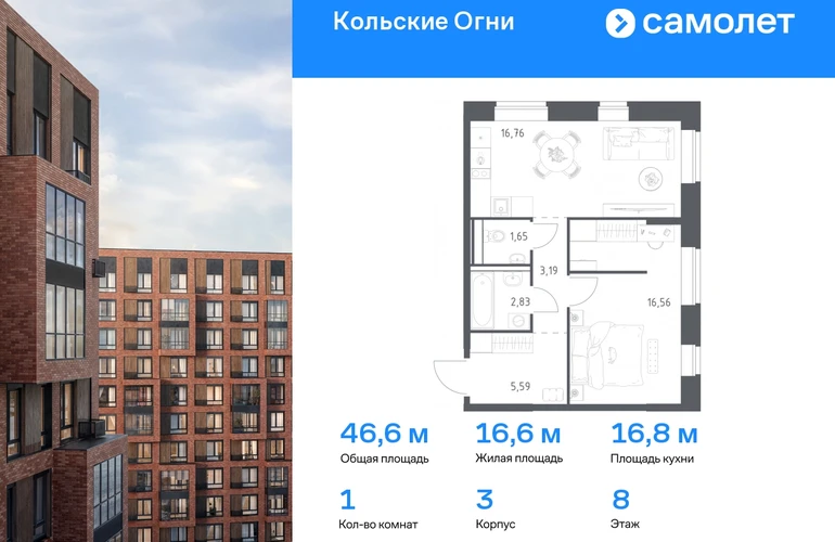 Строим кварталы для жизни с заботой о будущем. Предлагается 1-комнатная квартира комфорт-класса 46,58 кв.м в корпусе 3 на 8 этаже, в ЖК «Кольские Огни» Квартира без отделки. Доступность опции «отделка» и возможность комплектации мебелью и декором уточняйте у застройщика. Приобрести квартиру возможно по специальным акциям от застройщика, с текущими условиями акций можно ознакомиться в блоке «Акций». Цена динамическая и может отличаться, уточняйте актуальность у застройщика. Жилой комплекс «Кольские Огни» будет построен в Мурманской области, в городе Кола. Путь до центра Мурманска будет быстрым — всего 25 минут на машине. Рядом — Поморская набережная, парк, тундровый сад и лес всего в 10 минутах пешком. На первых этажах домов откроются кофейни и магазины, фитнес-зал и салон красоты, аптека, пункты выдачи заказов. Рядом с жилым комплексом работают детский сад, спортивная школа с бассейном и ФОК. Во дворе — озеленение, спортивные площадки, ремонт велосипедов, догхабы. Еще на территории квартала построим паркинг с зарядкой для электромобилей. Корпуса высотой 9–12 этажей и 14–17-этажные башни украшают деревянные панели. На входе в подъезды не будет ступеней и высоких порогов. После прогулки велосипеды и коляски можно оставить в местах хранения. Продуманные планировки от небольших студий до просторных 4-комнатных квартир. Отделка на выбор: готовая, White Box или вариант без нее. Выбирайте варианты без отделки, если хотите реализовать собственные решения.#yan19-2r1706718#О застройщике
