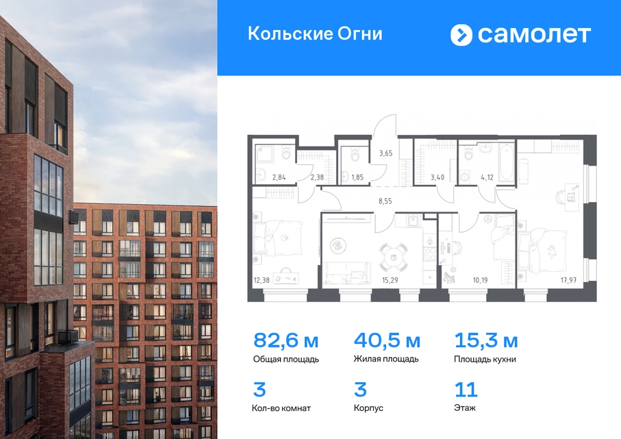 Строим кварталы для жизни с заботой о будущем. Предлагается 3-комнатная квартира комфорт-класса 82,62 кв.м в корпусе 3 на 11 этаже, в ЖК «Кольские Огни» Квартира без отделки. Доступность опции «отделка» и возможность комплектации мебелью и декором уточняйте у застройщика. Приобрести квартиру возможно по специальным акциям от застройщика, с текущими условиями акций можно ознакомиться в блоке «Акций». Цена динамическая и может отличаться, уточняйте актуальность у застройщика. Жилой комплекс «Кольские Огни» будет построен в Мурманской области, в городе Кола. Путь до центра Мурманска будет быстрым — всего 25 минут на машине. Рядом — Поморская набережная, парк, тундровый сад и лес всего в 10 минутах пешком. На первых этажах домов откроются кофейни и магазины, фитнес-зал и салон красоты, аптека, пункты выдачи заказов. Рядом с жилым комплексом работают детский сад, спортивная школа с бассейном и ФОК. Во дворе — озеленение, спортивные площадки, ремонт велосипедов, догхабы. Еще на территории квартала построим паркинг с зарядкой для электромобилей. Корпуса высотой 9–12 этажей и 14–17-этажные башни украшают деревянные панели. На входе в подъезды не будет ступеней и высоких порогов. После прогулки велосипеды и коляски можно оставить в местах хранения. Продуманные планировки от небольших студий до просторных 4-комнатных квартир. Отделка на выбор: готовая, White Box или вариант без нее. Выбирайте варианты без отделки, если хотите реализовать собственные решения.#yan19-2r1706721#О застройщике