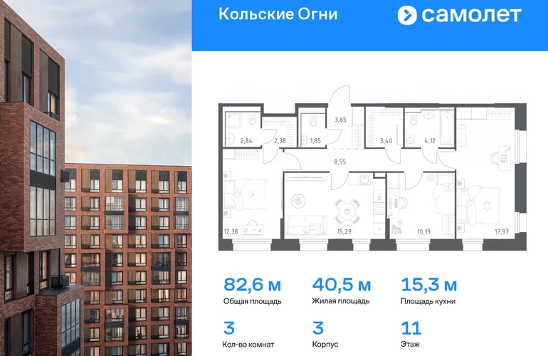 Строим кварталы для жизни с заботой о будущем. Предлагается 3-комнатная квартира комфорт-класса 82,62 кв.м в корпусе 3 на 11 этаже, в ЖК «Кольские Огни» Квартира без отделки. Доступность опции «отделка» и возможность комплектации мебелью и декором уточняйте у застройщика. Приобрести квартиру возможно по специальным акциям от застройщика, с текущими условиями акций можно ознакомиться в блоке «Акций». Цена динамическая и может отличаться, уточняйте актуальность у застройщика. Жилой комплекс «Кольские Огни» будет построен в Мурманской области, в городе Кола. Путь до центра Мурманска будет быстрым — всего 25 минут на машине. Рядом — Поморская набережная, парк, тундровый сад и лес всего в 10 минутах пешком. На первых этажах домов откроются кофейни и магазины, фитнес-зал и салон красоты, аптека, пункты выдачи заказов. Рядом с жилым комплексом работают детский сад, спортивная школа с бассейном и ФОК. Во дворе — озеленение, спортивные площадки, ремонт велосипедов, догхабы. Еще на территории квартала построим паркинг с зарядкой для электромобилей. Корпуса высотой 9–12 этажей и 14–17-этажные башни украшают деревянные панели. На входе в подъезды не будет ступеней и высоких порогов. После прогулки велосипеды и коляски можно оставить в местах хранения. Продуманные планировки от небольших студий до просторных 4-комнатных квартир. Отделка на выбор: готовая, White Box или вариант без нее. Выбирайте варианты без отделки, если хотите реализовать собственные решения.#yan19-2r1706721#О застройщике