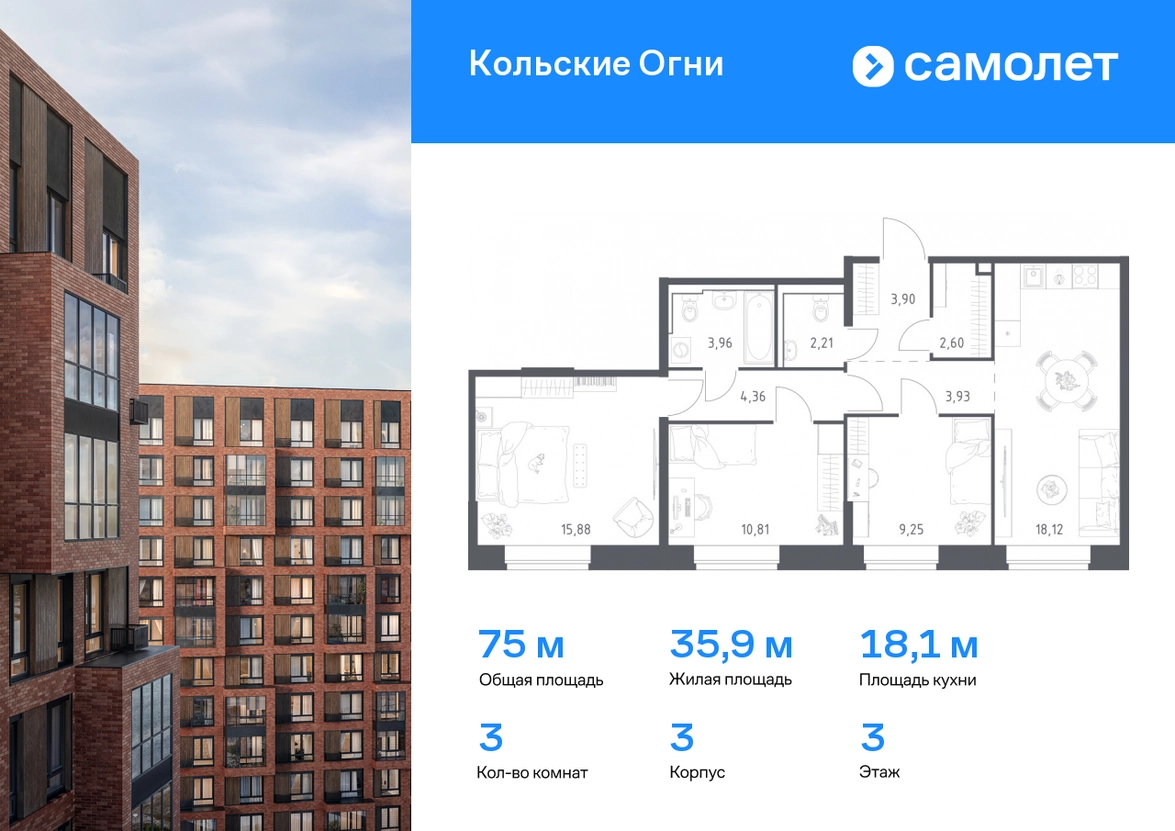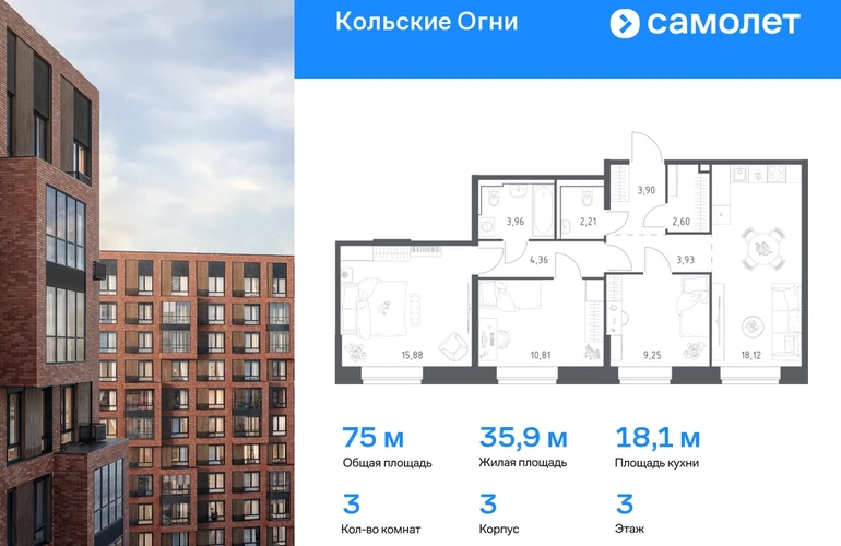Предлагается 3-комнатная квартира комфорт-класса 75,02 кв.м в корпусе 3 на 3 этаже, в ЖК «Кольские Огни» Квартира без отделки. Доступность опции "отделка" и возможность комплектации мебелью и декором уточняйте у застройщика. Приобрести квартиру возможно по специальным акциям от застройщика, с текущими условиями акций можно ознакомиться в блоке “Акций”. Цена динамическая и может отличаться, уточняйте актуальность у застройщика. Жилой комплекс «Кольские Огни» будет построен в Мурманской области, в городе Кола. Путь до центра Мурманска будет быстрым — всего 25 минут на машине. Рядом — Поморская набережная, парк, тундровый сад и лес всего в 10 минутах пешком. На первых этажах домов откроются кофейни и магазины, фитнес-зал и салон красоты, аптека, пункты выдачи заказов. Рядом с жилым комплексом работают детский сад, спортивная школа с бассейном и ФОК. Во дворе — озеленение, спортивные площадки, ремонт велосипедов, догхабы. Еще на территории квартала построим паркинг с зарядкой для электромобилей. Корпуса высотой 9–12 этажей и 14–17-этажные башни украшают деревянные панели. На входе в подъезды не будет ступеней и высоких порогов. После прогулки велосипеды и коляски можно оставить в местах хранения. Продуманные планировки от небольших студий до просторных 4-комнатных квартир. Отделка на выбор: готовая, White Box или вариант без нее. Выбирайте варианты без отделки, если хотите реализовать собственные решения.#yan19-2r1788783#О застройщике