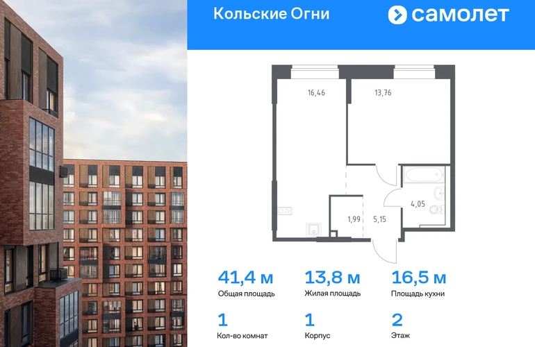 Строим кварталы для жизни с заботой о будущем. Предлагается 1-комнатная квартира комфорт-класса 41,41 кв.м в корпусе 1 на 2 этаже, в ЖК «Кольские Огни» Квартира без отделки. Доступность опции «отделка» и возможность комплектации мебелью и декором уточняйте у застройщика. Приобрести квартиру возможно по специальным акциям от застройщика, с текущими условиями акций можно ознакомиться в блоке «Акций». Цена динамическая и может отличаться, уточняйте актуальность у застройщика. Жилой комплекс «Кольские Огни» будет построен в Мурманской области, в городе Кола. Путь до центра Мурманска будет быстрым — всего 25 минут на машине. Рядом — Поморская набережная, парк, тундровый сад и лес всего в 10 минутах пешком. На первых этажах домов откроются кофейни и магазины, фитнес-зал и салон красоты, аптека, пункты выдачи заказов. Рядом с жилым комплексом работают детский сад, спортивная школа с бассейном и ФОК. Во дворе — озеленение, спортивные площадки, ремонт велосипедов, догхабы. Еще на территории квартала построим паркинг с зарядкой для электромобилей. Корпуса высотой 9–12 этажей и 14–17-этажные башни украшают деревянные панели. На входе в подъезды не будет ступеней и высоких порогов. После прогулки велосипеды и коляски можно оставить в местах хранения. Продуманные планировки от небольших студий до просторных 4-комнатных квартир. Отделка на выбор: готовая, White Box или вариант без нее. Выбирайте варианты без отделки, если хотите реализовать собственные решения.#yan19-2r1790229#О застройщике