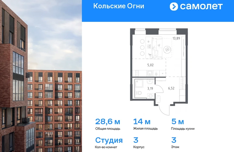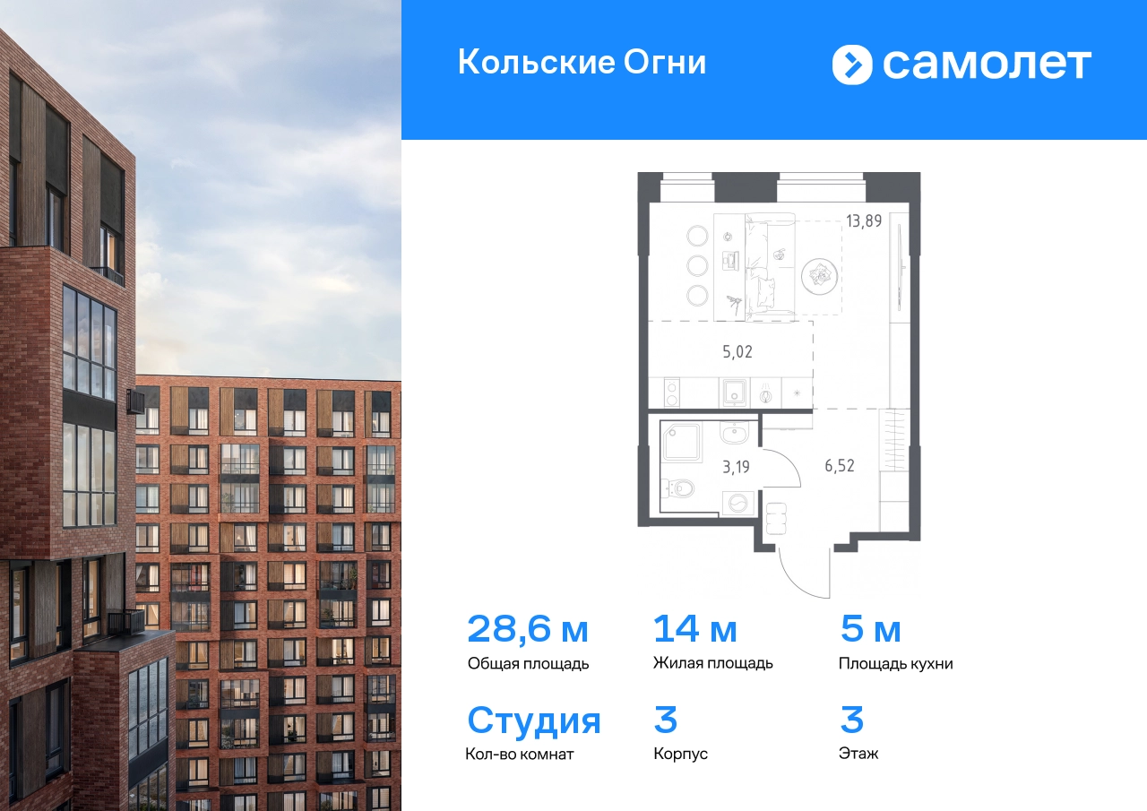 Предлагается квартира студия комфорт-класса 28,62 кв.м в корпусе 3 на 3 этаже, в ЖК «Кольские Огни» Квартира без отделки. Доступность опции "отделка" и возможность комплектации мебелью и декором уточняйте у застройщика. Приобрести квартиру возможно по специальным акциям от застройщика, с текущими условиями акций можно ознакомиться в блоке “Акций”. Цена динамическая и может отличаться, уточняйте актуальность у застройщика. Жилой комплекс «Кольские Огни» будет построен в Мурманской области, в городе Кола. Путь до центра Мурманска будет быстрым — всего 25 минут на машине. Рядом — Поморская набережная, парк, тундровый сад и лес всего в 10 минутах пешком. На первых этажах домов откроются кофейни и магазины, фитнес-зал и салон красоты, аптека, пункты выдачи заказов. Рядом с жилым комплексом работают детский сад, спортивная школа с бассейном и ФОК. Во дворе — озеленение, спортивные площадки, ремонт велосипедов, догхабы. Еще на территории квартала построим паркинг с зарядкой для электромобилей. Корпуса высотой 9–12 этажей и 14–17-этажные башни украшают деревянные панели. На входе в подъезды не будет ступеней и высоких порогов. После прогулки велосипеды и коляски можно оставить в местах хранения. Продуманные планировки от небольших студий до просторных 4-комнатных квартир. Отделка на выбор: готовая, White Box или вариант без нее. Выбирайте варианты без отделки, если хотите реализовать собственные решения.#yan19-2r1790232#О застройщике