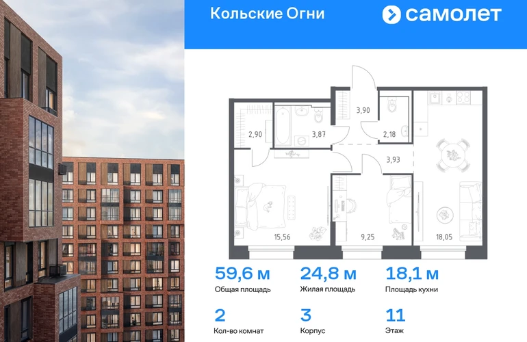 Строим кварталы для жизни с заботой о будущем. Предлагается 2-комнатная квартира комфорт-класса 59,64 кв.м в корпусе 3 на 11 этаже, в ЖК «Кольские Огни» Квартира без отделки. Доступность опции «отделка» и возможность комплектации мебелью и декором уточняйте у застройщика. Приобрести квартиру возможно по специальным акциям от застройщика, с текущими условиями акций можно ознакомиться в блоке «Акций». Цена динамическая и может отличаться, уточняйте актуальность у застройщика. Жилой комплекс «Кольские Огни» будет построен в Мурманской области, в городе Кола. Путь до центра Мурманска будет быстрым — всего 25 минут на машине. Рядом — Поморская набережная, парк, тундровый сад и лес всего в 10 минутах пешком. На первых этажах домов откроются кофейни и магазины, фитнес-зал и салон красоты, аптека, пункты выдачи заказов. Рядом с жилым комплексом работают детский сад, спортивная школа с бассейном и ФОК. Во дворе — озеленение, спортивные площадки, ремонт велосипедов, догхабы. Еще на территории квартала построим паркинг с зарядкой для электромобилей. Корпуса высотой 9–12 этажей и 14–17-этажные башни украшают деревянные панели. На входе в подъезды не будет ступеней и высоких порогов. После прогулки велосипеды и коляски можно оставить в местах хранения. Продуманные планировки от небольших студий до просторных 4-комнатных квартир. Отделка на выбор: готовая, White Box или вариант без нее. Выбирайте варианты без отделки, если хотите реализовать собственные решения.#yan19-2r1810709#О застройщике