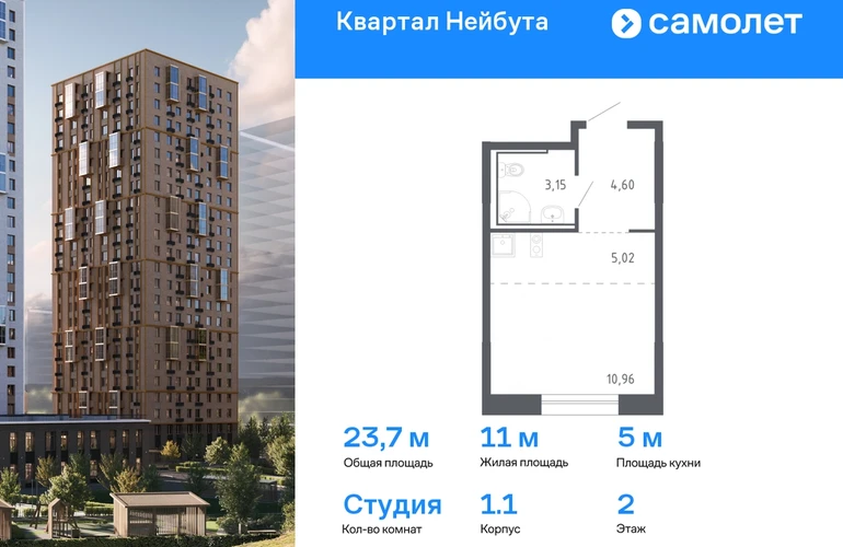 Предлагается квартира студия комфорт-класса 23,73 кв.м в корпусе 1.1 на 2 этаже, в ЖК «Квартал Нейбута» Квартира с чистовой отделкой. Доступность дополнительных опций уточняйте у застройщика. Приобрести квартиру возможно по специальным акциям от застройщика, с текущими условиями акций можно ознакомиться в блоке “Акций”. Цена динамическая и может отличаться, уточняйте актуальность у застройщика. В новом «Квартале Нейбута» захочется освободить галерею телефона — чтобы вместить коллекцию по-настоящему захватывающих кадров. В объектив вашей камеры попадут зеленые сопки, бескрайнее небо и другие красоты Приморского края. Квартал находится в одном из районов Владивостока, откуда легко добраться в любую точку города. Дорога до центра города, морского и ж/д вокзалов займет 30 минут на машине или 45 минут на автобусе. Планировать отпуск тоже удобно — международный аэропорт находится в часе езды от дома. Скоро в квартале будет удобный выезд на улицы Нейбута и Фадеева, откуда можно попасть на трассу Патрокл — Седанка — Де-Фриз — Новый. А к старту первой очереди будет готов северный заезд с твердым покрытием. В квартале можно выйти из дома и оказаться в большом парке с экотропами и прогулочными зонами. Выходите на пробежку или на познавательную прогулку с детьми — можно долго рассматривать растения и искать их названия в интернете. Побродите по тропам для терренкура и обязательно побывайте на смотровых площадках — ваша коллекция впечатлений точно пополнится. Вечером отправляйтесь полюбоваться на вантовый мост в свете огней. Вид на него откроется из бухты Золотой Рог, дорога до которой займет 20 минут на авто. Чтобы решать все повседневные дела, даже не обязательно далеко уходить от дома. На первых этажах корпусов откроются салоны красоты, магазины, пункты выдачи и кафе. Забегайте за утренним латте, новой прической или продуктами к обеду. Юным жителям квартала тоже не придется долго шагать по своим важным делам. Рядом с кварталом находятся 3 детских сада, общеобразовательная и школа искусств и развивающий центр «Пчелкин дом». А скоро недалеко от проекта появится еще одна школа на 1100 учеников. Ее планируют строить в 2026 году. 26-этажные дома с отделкой золотистых и благородных коричневых оттенков гармонично впишутся в живописный дальневосточный пейзаж. Объем фасадам придают витражные балконы, с которых открываются виды на Уссурийский залив. Закрытые дворы без машин — маленький мир, вдохновленный природой Приморского края. Стены домов украшают дальневосточные лианы, крыши — пышные ковры из трав. Еще мы установим дождевые сады, которые скроют последствия даже самого сильного ливня. Во дворе найдется интересное занятие для всех жителей квартала. Взрослые смогут устраивать тренировки на свежем воздухе в спортивных зонах, дети будут целый день веселиться на игровых площадках. А для четвероногих питомцев мы предусмотрели специальные зоны для выгула. Возвращайтесь домой из отпуска с чемоданом сувениров или самокатом из парка. Мы отказались от ступенек и порогов у входов в подъезд, поэтому путь будет легким и удобным. Оставить коляску или велосипед можно на первом этаже, в специальном помещении. А бабушкины закрутки и сноуборд можно хранить в кладовых на подземном этаже. Среди разнообразных планировок вы наверняка найдете квартиру меч
