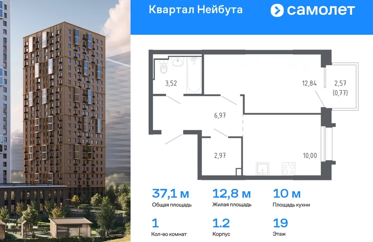 Предлагается 1-комнатная квартира комфорт-класса 37,07 кв.м в корпусе 1.2 на 19 этаже, в ЖК «Квартал Нейбута» Квартира с чистовой отделкой. Доступность дополнительных опций уточняйте у застройщика. Приобрести квартиру возможно по специальным акциям от застройщика, с текущими условиями акций можно ознакомиться в блоке «Акций». Цена динамическая и может отличаться, уточняйте актуальность у застройщика. В новом «Квартале Нейбута» захочется освободить галерею телефона — чтобы вместить коллекцию по-настоящему захватывающих кадров. В объектив вашей камеры попадут зеленые сопки, бескрайнее небо и другие красоты Приморского края. Квартал находится в одном из районов Владивостока, откуда легко добраться в любую точку города. Дорога до центра города, морского и ж/д вокзалов займет 30 минут на машине или 45 минут на автобусе. Планировать отпуск тоже удобно — международный аэропорт находится в часе езды от дома. Скоро в квартале будет удобный выезд на улицы Нейбута и Фадеева, откуда можно попасть на трассу Патрокл — Седанка — Де-Фриз — Новый. А к старту первой очереди будет готов северный заезд с твердым покрытием. В квартале можно выйти из дома и оказаться в большом парке с экотропами и прогулочными зонами. Выходите на пробежку или на познавательную прогулку с детьми — можно долго рассматривать растения и искать их названия в интернете. Побродите по тропам для терренкура и обязательно побывайте на смотровых площадках — ваша коллекция впечатлений точно пополнится. Вечером отправляйтесь полюбоваться на вантовый мост в свете огней. Вид на него откроется из бухты Золотой Рог, дорога до которой займет 20 минут на авто. Чтобы решать все повседневные дела, даже не обязательно далеко уходить от дома. На первых этажах корпусов откроются салоны красоты, магазины, пункты выдачи и кафе. Забегайте за утренним латте, новой прической или продуктами к обеду. Юным жителям квартала тоже не придется долго шагать по своим важным делам. Рядом с кварталом находятся 3 детских сада, общеобразовательная и школа искусств и развивающий центр «Пчелкин дом». А скоро недалеко от проекта появится еще одна школа на 1100 учеников. Ее планируют строить в 2026 году. 26-этажные дома с отделкой золотистых и благородных коричневых оттенков гармонично впишутся в живописный дальневосточный пейзаж. Объем фасадам придают витражные балконы, с которых открываются виды на Уссурийский залив. Закрытые дворы без машин — маленький мир, вдохновленный природой Приморского края. Стены домов украшают дальневосточные лианы, крыши — пышные ковры из трав. Еще мы установим дождевые сады, которые скроют последствия даже самого сильного ливня. Во дворе найдется интересное занятие для всех жителей квартала. Взрослые смогут устраивать тренировки на свежем воздухе в спортивных зонах, дети будут целый день веселиться на игровых площадках. А для четвероногих питомцев мы предусмотрели специальные зоны для выгула. Возвращайтесь домой из отпуска с чемоданом сувениров или самокатом из парка. Мы отказались от ступенек и порогов у входов в подъезд, поэтому путь будет легким и удобным. Оставить коляску или велосипед можно на первом этаже, в специальном помещении. А бабушкины закрутки и сноуборд можно хранить в кладовых на подземном этаже. Среди разнообразных планировок вы наверняка найдете квартиру
