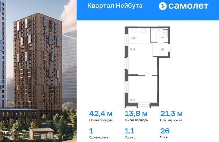 Строим кварталы для жизни с заботой о будущем. Предлагается 1-комнатная квартира комфорт-класса 42,36 кв.м в корпусе 1.1 на 26 этаже, в ЖК «Квартал Нейбута» Квартира с чистовой отделкой. Доступность дополнительных опций уточняйте у застройщика. Приобрести квартиру возможно по специальным акциям от застройщика, с текущими условиями акций можно ознакомиться в блоке «Акций». Цена динамическая и может отличаться, уточняйте актуальность у застройщика. «Квартал Нейбута» находится в Ленинском районе Владивостока. Дорога до центра города, морского и ж/д вокзалов займет 30 минут на машине или 45 минут на автобусе. Международный аэропорт находится в часе езды от дома. Скоро в квартале будет удобный выезд, откуда можно попасть на трассу Патрокл — Седанка — Де-Фриз — Новый. 26-этажные дома с отделкой золотистых и благородных коричневых оттенков гармонично впишутся в живописный дальневосточный пейзаж. Объем фасадам придают витражные балконы. Закрытые дворы без машин — маленький мир, вдохновленный природой Приморского края. Во дворе найдется занятие для всех жителей квартала. Взрослые смогут устраивать тренировки в спортивных зонах, дети будут веселиться на игровых площадках. А для четвероногих питомцев мы предусмотрели специальные зоны для выгула. Мы отказались от ступенек и порогов у входов в подъезд. Оставить коляску или велосипед можно на первом этаже, в специальном помещении. На подземном этаже предусмотрены кладовые.#yan19-2r1761268#О застройщике