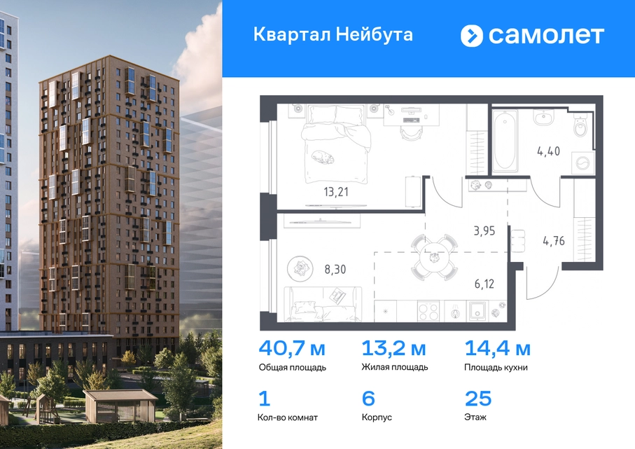 Предлагается 1-комнатная квартира комфорт-класса 40,74 кв.м в корпусе 6 на 25 этаже, в ЖК «Квартал Нейбута» Квартира с предчистовой отделкой. Доступность дополнительных опций уточняйте у застройщика. Приобрести квартиру возможно по специальным акциям от застройщика, с текущими условиями акций можно ознакомиться в блоке “Акций”. Цена динамическая и может отличаться, уточняйте актуальность у застройщика. В новом «Квартале Нейбута» захочется освободить галерею телефона — чтобы вместить коллекцию по-настоящему захватывающих кадров. В объектив вашей камеры попадут зеленые сопки, бескрайнее небо и другие красоты Приморского края. Квартал находится в одном из районов Владивостока, откуда легко добраться в любую точку города. Дорога до центра города, морского и ж/д вокзалов займет 30 минут на машине или 45 минут на автобусе. Планировать отпуск тоже удобно — международный аэропорт находится в часе езды от дома. Скоро в квартале будет удобный выезд на улицы Нейбута и Фадеева, откуда можно попасть на трассу Патрокл — Седанка — Де-Фриз — Новый. А к старту первой очереди будет готов северный заезд с твердым покрытием. В квартале можно выйти из дома и оказаться в большом парке с экотропами и прогулочными зонами. Выходите на пробежку или на познавательную прогулку с детьми — можно долго рассматривать растения и искать их названия в интернете. Побродите по тропам для терренкура и обязательно побывайте на смотровых площадках — ваша коллекция впечатлений точно пополнится. Вечером отправляйтесь полюбоваться на вантовый мост в свете огней. Вид на него откроется из бухты Золотой Рог, дорога до которой займет 20 минут на авто. Чтобы решать все повседневные дела, даже не обязательно далеко уходить от дома. На первых этажах корпусов откроются салоны красоты, магазины, пункты выдачи и кафе. Забегайте за утренним латте, новой прической или продуктами к обеду. Юным жителям квартала тоже не придется долго шагать по своим важным делам. Рядом с кварталом находятся 3 детских сада, общеобразовательная и школа искусств и развивающий центр «Пчелкин дом». А скоро недалеко от проекта появится еще одна школа на 1100 учеников. Ее планируют строить в 2026 году. 26-этажные дома с отделкой золотистых и благородных коричневых оттенков гармонично впишутся в живописный дальневосточный пейзаж. Объем фасадам придают витражные балконы, с которых открываются виды на Уссурийский залив. Закрытые дворы без машин — маленький мир, вдохновленный природой Приморского края. Стены домов украшают дальневосточные лианы, крыши — пышные ковры из трав. Еще мы установим дождевые сады, которые скроют последствия даже самого сильного ливня. Во дворе найдется интересное занятие для всех жителей квартала. Взрослые смогут устраивать тренировки на свежем воздухе в спортивных зонах, дети будут целый день веселиться на игровых площадках. А для четвероногих питомцев мы предусмотрели специальные зоны для выгула. Возвращайтесь домой из отпуска с чемоданом сувениров или самокатом из парка. Мы отказались от ступенек и порогов у входов в подъезд, поэтому путь будет легким и удобным. Оставить коляску или велосипед можно на первом этаже, в специальном помещении. А бабушкины закрутки и сноуборд можно хранить в кладовых на подземном этаже. Среди разнообразных планировок вы наверняка найдете квар