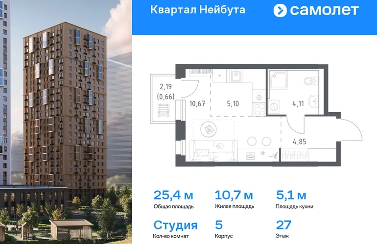 Предлагается квартира студия комфорт-класса 25,39 кв.м в корпусе 5 на 27 этаже, в ЖК «Квартал Нейбута» Квартира с чистовой отделкой. Доступность дополнительных опций уточняйте у застройщика. Приобрести квартиру возможно по специальным акциям от застройщика, с текущими условиями акций можно ознакомиться в блоке “Акций”. Цена динамическая и может отличаться, уточняйте актуальность у застройщика. В новом «Квартале Нейбута» захочется освободить галерею телефона — чтобы вместить коллекцию по-настоящему захватывающих кадров. В объектив вашей камеры попадут зеленые сопки, бескрайнее небо и другие красоты Приморского края. Квартал находится в одном из районов Владивостока, откуда легко добраться в любую точку города. Дорога до центра города, морского и ж/д вокзалов займет 30 минут на машине или 45 минут на автобусе. Планировать отпуск тоже удобно — международный аэропорт находится в часе езды от дома. Скоро в квартале будет удобный выезд на улицы Нейбута и Фадеева, откуда можно попасть на трассу Патрокл — Седанка — Де-Фриз — Новый. А к старту первой очереди будет готов северный заезд с твердым покрытием. В квартале можно выйти из дома и оказаться в большом парке с экотропами и прогулочными зонами. Выходите на пробежку или на познавательную прогулку с детьми — можно долго рассматривать растения и искать их названия в интернете. Побродите по тропам для терренкура и обязательно побывайте на смотровых площадках — ваша коллекция впечатлений точно пополнится. Вечером отправляйтесь полюбоваться на вантовый мост в свете огней. Вид на него откроется из бухты Золотой Рог, дорога до которой займет 20 минут на авто. Чтобы решать все повседневные дела, даже не обязательно далеко уходить от дома. На первых этажах корпусов откроются салоны красоты, магазины, пункты выдачи и кафе. Забегайте за утренним латте, новой прической или продуктами к обеду. Юным жителям квартала тоже не придется долго шагать по своим важным делам. Рядом с кварталом находятся 3 детских сада, общеобразовательная и школа искусств и развивающий центр «Пчелкин дом». А скоро недалеко от проекта появится еще одна школа на 1100 учеников. Ее планируют строить в 2026 году. 26-этажные дома с отделкой золотистых и благородных коричневых оттенков гармонично впишутся в живописный дальневосточный пейзаж. Объем фасадам придают витражные балконы, с которых открываются виды на Уссурийский залив. Закрытые дворы без машин — маленький мир, вдохновленный природой Приморского края. Стены домов украшают дальневосточные лианы, крыши — пышные ковры из трав. Еще мы установим дождевые сады, которые скроют последствия даже самого сильного ливня. Во дворе найдется интересное занятие для всех жителей квартала. Взрослые смогут устраивать тренировки на свежем воздухе в спортивных зонах, дети будут целый день веселиться на игровых площадках. А для четвероногих питомцев мы предусмотрели специальные зоны для выгула. Возвращайтесь домой из отпуска с чемоданом сувениров или самокатом из парка. Мы отказались от ступенек и порогов у входов в подъезд, поэтому путь будет легким и удобным. Оставить коляску или велосипед можно на первом этаже, в специальном помещении. А бабушкины закрутки и сноуборд можно хранить в кладовых на подземном этаже. Среди разнообразных планировок вы наверняка найдете квартиру меч