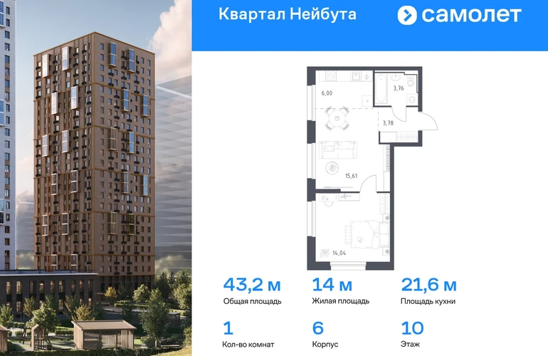 Предлагается 1-комнатная квартира комфорт-класса 43,19 кв.м в корпусе 6 на 10 этаже, в ЖК «Квартал Нейбута» Квартира с предчистовой отделкой. Доступность дополнительных опций уточняйте у застройщика. Приобрести квартиру возможно по специальным акциям от застройщика, с текущими условиями акций можно ознакомиться в блоке “Акций”. Цена динамическая и может отличаться, уточняйте актуальность у застройщика. В новом «Квартале Нейбута» захочется освободить галерею телефона — чтобы вместить коллекцию по-настоящему захватывающих кадров. В объектив вашей камеры попадут зеленые сопки, бескрайнее небо и другие красоты Приморского края. Квартал находится в одном из районов Владивостока, откуда легко добраться в любую точку города. Дорога до центра города, морского и ж/д вокзалов займет 30 минут на машине или 45 минут на автобусе. Планировать отпуск тоже удобно — международный аэропорт находится в часе езды от дома. Скоро в квартале будет удобный выезд на улицы Нейбута и Фадеева, откуда можно попасть на трассу Патрокл — Седанка — Де-Фриз — Новый. А к старту первой очереди будет готов северный заезд с твердым покрытием. В квартале можно выйти из дома и оказаться в большом парке с экотропами и прогулочными зонами. Выходите на пробежку или на познавательную прогулку с детьми — можно долго рассматривать растения и искать их названия в интернете. Побродите по тропам для терренкура и обязательно побывайте на смотровых площадках — ваша коллекция впечатлений точно пополнится. Вечером отправляйтесь полюбоваться на вантовый мост в свете огней. Вид на него откроется из бухты Золотой Рог, дорога до которой займет 20 минут на авто. Чтобы решать все повседневные дела, даже не обязательно далеко уходить от дома. На первых этажах корпусов откроются салоны красоты, магазины, пункты выдачи и кафе. Забегайте за утренним латте, новой прической или продуктами к обеду. Юным жителям квартала тоже не придется долго шагать по своим важным делам. Рядом с кварталом находятся 3 детских сада, общеобразовательная и школа искусств и развивающий центр «Пчелкин дом». А скоро недалеко от проекта появится еще одна школа на 1100 учеников. Ее планируют строить в 2026 году. 26-этажные дома с отделкой золотистых и благородных коричневых оттенков гармонично впишутся в живописный дальневосточный пейзаж. Объем фасадам придают витражные балконы, с которых открываются виды на Уссурийский залив. Закрытые дворы без машин — маленький мир, вдохновленный природой Приморского края. Стены домов украшают дальневосточные лианы, крыши — пышные ковры из трав. Еще мы установим дождевые сады, которые скроют последствия даже самого сильного ливня. Во дворе найдется интересное занятие для всех жителей квартала. Взрослые смогут устраивать тренировки на свежем воздухе в спортивных зонах, дети будут целый день веселиться на игровых площадках. А для четвероногих питомцев мы предусмотрели специальные зоны для выгула. Возвращайтесь домой из отпуска с чемоданом сувениров или самокатом из парка. Мы отказались от ступенек и порогов у входов в подъезд, поэтому путь будет легким и удобным. Оставить коляску или велосипед можно на первом этаже, в специальном помещении. А бабушкины закрутки и сноуборд можно хранить в кладовых на подземном этаже. Среди разнообразных планировок вы наверняка найдете квар
