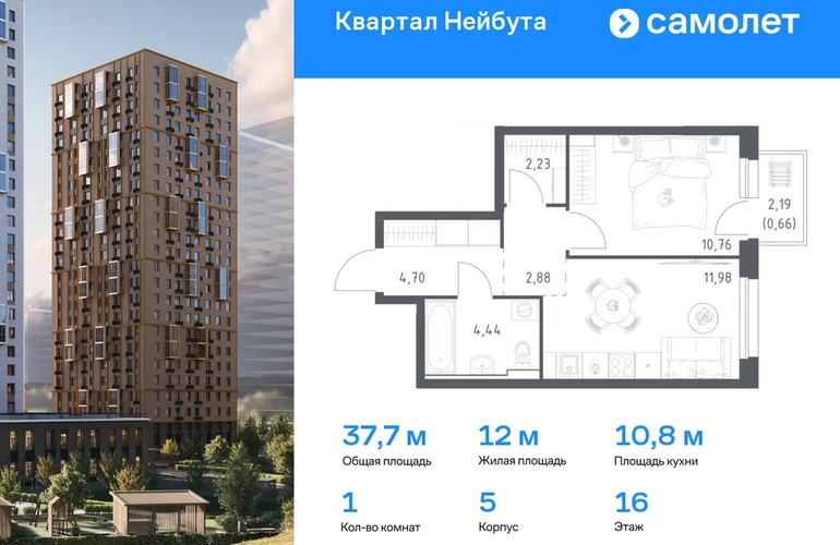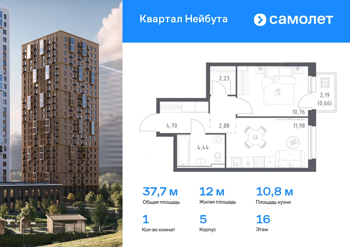 Предлагается 1-комнатная квартира комфорт-класса 37,65 кв.м в корпусе 5 на 16 этаже, в ЖК «Квартал Нейбута» Квартира с чистовой отделкой. Доступность дополнительных опций уточняйте у застройщика. Приобрести квартиру возможно по специальным акциям от застройщика, с текущими условиями акций можно ознакомиться в блоке «Акций». Цена динамическая и может отличаться, уточняйте актуальность у застройщика. В новом «Квартале Нейбута» захочется освободить галерею телефона — чтобы вместить коллекцию по-настоящему захватывающих кадров. В объектив вашей камеры попадут зеленые сопки, бескрайнее небо и другие красоты Приморского края. Квартал находится в одном из районов Владивостока, откуда легко добраться в любую точку города. Дорога до центра города, морского и ж/д вокзалов займет 30 минут на машине или 45 минут на автобусе. Планировать отпуск тоже удобно — международный аэропорт находится в часе езды от дома. Скоро в квартале будет удобный выезд на улицы Нейбута и Фадеева, откуда можно попасть на трассу Патрокл — Седанка — Де-Фриз — Новый. А к старту первой очереди будет готов северный заезд с твердым покрытием. В квартале можно выйти из дома и оказаться в большом парке с экотропами и прогулочными зонами. Выходите на пробежку или на познавательную прогулку с детьми — можно долго рассматривать растения и искать их названия в интернете. Побродите по тропам для терренкура и обязательно побывайте на смотровых площадках — ваша коллекция впечатлений точно пополнится. Вечером отправляйтесь полюбоваться на вантовый мост в свете огней. Вид на него откроется из бухты Золотой Рог, дорога до которой займет 20 минут на авто. Чтобы решать все повседневные дела, даже не обязательно далеко уходить от дома. На первых этажах корпусов откроются салоны красоты, магазины, пункты выдачи и кафе. Забегайте за утренним латте, новой прической или продуктами к обеду. Юным жителям квартала тоже не придется долго шагать по своим важным делам. Рядом с кварталом находятся 3 детских сада, общеобразовательная и школа искусств и развивающий центр «Пчелкин дом». А скоро недалеко от проекта появится еще одна школа на 1100 учеников. Ее планируют строить в 2026 году. 26-этажные дома с отделкой золотистых и благородных коричневых оттенков гармонично впишутся в живописный дальневосточный пейзаж. Объем фасадам придают витражные балконы, с которых открываются виды на Уссурийский залив. Закрытые дворы без машин — маленький мир, вдохновленный природой Приморского края. Стены домов украшают дальневосточные лианы, крыши — пышные ковры из трав. Еще мы установим дождевые сады, которые скроют последствия даже самого сильного ливня. Во дворе найдется интересное занятие для всех жителей квартала. Взрослые смогут устраивать тренировки на свежем воздухе в спортивных зонах, дети будут целый день веселиться на игровых площадках. А для четвероногих питомцев мы предусмотрели специальные зоны для выгула. Возвращайтесь домой из отпуска с чемоданом сувениров или самокатом из парка. Мы отказались от ступенек и порогов у входов в подъезд, поэтому путь будет легким и удобным. Оставить коляску или велосипед можно на первом этаже, в специальном помещении. А бабушкины закрутки и сноуборд можно хранить в кладовых на подземном этаже. Среди разнообразных планировок вы наверняка найдете квартиру 