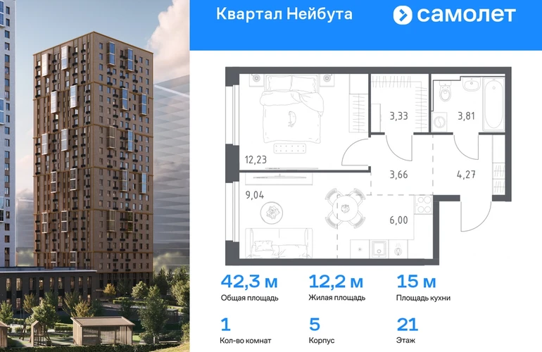 Предлагается 1-комнатная квартира комфорт-класса 42,34 кв.м в корпусе 5 на 21 этаже, в ЖК «Квартал Нейбута» Квартира с чистовой отделкой. Доступность дополнительных опций уточняйте у застройщика. Приобрести квартиру возможно по специальным акциям от застройщика, с текущими условиями акций можно ознакомиться в блоке “Акций”. Цена динамическая и может отличаться, уточняйте актуальность у застройщика. В новом «Квартале Нейбута» захочется освободить галерею телефона — чтобы вместить коллекцию по-настоящему захватывающих кадров. В объектив вашей камеры попадут зеленые сопки, бескрайнее небо и другие красоты Приморского края. Квартал находится в одном из районов Владивостока, откуда легко добраться в любую точку города. Дорога до центра города, морского и ж/д вокзалов займет 30 минут на машине или 45 минут на автобусе. Планировать отпуск тоже удобно — международный аэропорт находится в часе езды от дома. Скоро в квартале будет удобный выезд на улицы Нейбута и Фадеева, откуда можно попасть на трассу Патрокл — Седанка — Де-Фриз — Новый. А к старту первой очереди будет готов северный заезд с твердым покрытием. В квартале можно выйти из дома и оказаться в большом парке с экотропами и прогулочными зонами. Выходите на пробежку или на познавательную прогулку с детьми — можно долго рассматривать растения и искать их названия в интернете. Побродите по тропам для терренкура и обязательно побывайте на смотровых площадках — ваша коллекция впечатлений точно пополнится. Вечером отправляйтесь полюбоваться на вантовый мост в свете огней. Вид на него откроется из бухты Золотой Рог, дорога до которой займет 20 минут на авто. Чтобы решать все повседневные дела, даже не обязательно далеко уходить от дома. На первых этажах корпусов откроются салоны красоты, магазины, пункты выдачи и кафе. Забегайте за утренним латте, новой прической или продуктами к обеду. Юным жителям квартала тоже не придется долго шагать по своим важным делам. Рядом с кварталом находятся 3 детских сада, общеобразовательная и школа искусств и развивающий центр «Пчелкин дом». А скоро недалеко от проекта появится еще одна школа на 1100 учеников. Ее планируют строить в 2026 году. 26-этажные дома с отделкой золотистых и благородных коричневых оттенков гармонично впишутся в живописный дальневосточный пейзаж. Объем фасадам придают витражные балконы, с которых открываются виды на Уссурийский залив. Закрытые дворы без машин — маленький мир, вдохновленный природой Приморского края. Стены домов украшают дальневосточные лианы, крыши — пышные ковры из трав. Еще мы установим дождевые сады, которые скроют последствия даже самого сильного ливня. Во дворе найдется интересное занятие для всех жителей квартала. Взрослые смогут устраивать тренировки на свежем воздухе в спортивных зонах, дети будут целый день веселиться на игровых площадках. А для четвероногих питомцев мы предусмотрели специальные зоны для выгула. Возвращайтесь домой из отпуска с чемоданом сувениров или самокатом из парка. Мы отказались от ступенек и порогов у входов в подъезд, поэтому путь будет легким и удобным. Оставить коляску или велосипед можно на первом этаже, в специальном помещении. А бабушкины закрутки и сноуборд можно хранить в кладовых на подземном этаже. Среди разнообразных планировок вы наверняка найдете квартиру