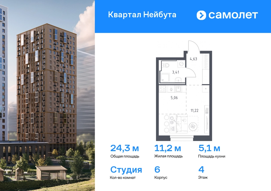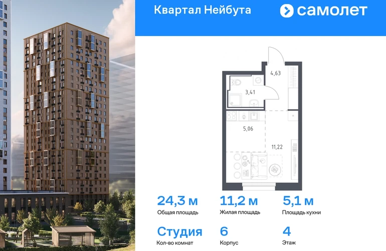 Предлагается квартира студия комфорт-класса 24,32 кв.м в корпусе 6 на 4 этаже, в ЖК «Квартал Нейбута» Квартира с предчистовой отделкой. Доступность дополнительных опций уточняйте у застройщика. Приобрести квартиру возможно по специальным акциям от застройщика, с текущими условиями акций можно ознакомиться в блоке “Акций”. Цена динамическая и может отличаться, уточняйте актуальность у застройщика. В новом «Квартале Нейбута» захочется освободить галерею телефона — чтобы вместить коллекцию по-настоящему захватывающих кадров. В объектив вашей камеры попадут зеленые сопки, бескрайнее небо и другие красоты Приморского края. Квартал находится в одном из районов Владивостока, откуда легко добраться в любую точку города. Дорога до центра города, морского и ж/д вокзалов займет 30 минут на машине или 45 минут на автобусе. Планировать отпуск тоже удобно — международный аэропорт находится в часе езды от дома. Скоро в квартале будет удобный выезд на улицы Нейбута и Фадеева, откуда можно попасть на трассу Патрокл — Седанка — Де-Фриз — Новый. А к старту первой очереди будет готов северный заезд с твердым покрытием. В квартале можно выйти из дома и оказаться в большом парке с экотропами и прогулочными зонами. Выходите на пробежку или на познавательную прогулку с детьми — можно долго рассматривать растения и искать их названия в интернете. Побродите по тропам для терренкура и обязательно побывайте на смотровых площадках — ваша коллекция впечатлений точно пополнится. Вечером отправляйтесь полюбоваться на вантовый мост в свете огней. Вид на него откроется из бухты Золотой Рог, дорога до которой займет 20 минут на авто. Чтобы решать все повседневные дела, даже не обязательно далеко уходить от дома. На первых этажах корпусов откроются салоны красоты, магазины, пункты выдачи и кафе. Забегайте за утренним латте, новой прической или продуктами к обеду. Юным жителям квартала тоже не придется долго шагать по своим важным делам. Рядом с кварталом находятся 3 детских сада, общеобразовательная и школа искусств и развивающий центр «Пчелкин дом». А скоро недалеко от проекта появится еще одна школа на 1100 учеников. Ее планируют строить в 2026 году. 26-этажные дома с отделкой золотистых и благородных коричневых оттенков гармонично впишутся в живописный дальневосточный пейзаж. Объем фасадам придают витражные балконы, с которых открываются виды на Уссурийский залив. Закрытые дворы без машин — маленький мир, вдохновленный природой Приморского края. Стены домов украшают дальневосточные лианы, крыши — пышные ковры из трав. Еще мы установим дождевые сады, которые скроют последствия даже самого сильного ливня. Во дворе найдется интересное занятие для всех жителей квартала. Взрослые смогут устраивать тренировки на свежем воздухе в спортивных зонах, дети будут целый день веселиться на игровых площадках. А для четвероногих питомцев мы предусмотрели специальные зоны для выгула. Возвращайтесь домой из отпуска с чемоданом сувениров или самокатом из парка. Мы отказались от ступенек и порогов у входов в подъезд, поэтому путь будет легким и удобным. Оставить коляску или велосипед можно на первом этаже, в специальном помещении. А бабушкины закрутки и сноуборд можно хранить в кладовых на подземном этаже. Среди разнообразных планировок вы наверняка найдете квартиру 