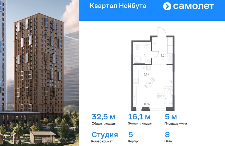 Строим кварталы для жизни с заботой о будущем. Предлагается квартира студия комфорт-класса 32,5 кв.м в корпусе 5 на 8 этаже, в ЖК «Квартал Нейбута» Квартира с чистовой отделкой. Доступность дополнительных опций уточняйте у застройщика. Приобрести квартиру возможно по специальным акциям от застройщика, с текущими условиями акций можно ознакомиться в блоке «Акций». Цена динамическая и может отличаться, уточняйте актуальность у застройщика. «Квартал Нейбута» находится в Ленинском районе Владивостока. Дорога до центра города, морского и ж/д вокзалов займет 30 минут на машине или 45 минут на автобусе. Международный аэропорт находится в часе езды от дома. Скоро в квартале будет удобный выезд, откуда можно попасть на трассу Патрокл — Седанка — Де-Фриз — Новый. 26-этажные дома с отделкой золотистых и благородных коричневых оттенков гармонично впишутся в живописный дальневосточный пейзаж. Объем фасадам придают витражные балконы. Закрытые дворы без машин — маленький мир, вдохновленный природой Приморского края. Во дворе найдется занятие для всех жителей квартала. Взрослые смогут устраивать тренировки в спортивных зонах, дети будут веселиться на игровых площадках. А для четвероногих питомцев мы предусмотрели специальные зоны для выгула. Мы отказались от ступенек и порогов у входов в подъезд. Оставить коляску или велосипед можно на первом этаже, в специальном помещении. На подземном этаже предусмотрены кладовые.#yan19-2r1778100#О застройщике