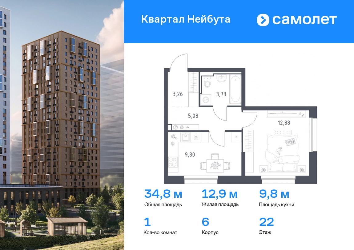 Предлагается 1-комнатная квартира комфорт-класса 34,75 кв.м в корпусе 6 на 22 этаже, в ЖК «Квартал Нейбута» Квартира с предчистовой отделкой. Доступность дополнительных опций уточняйте у застройщика. Приобрести квартиру возможно по специальным акциям от застройщика, с текущими условиями акций можно ознакомиться в блоке “Акций”. Цена динамическая и может отличаться, уточняйте актуальность у застройщика. В новом «Квартале Нейбута» захочется освободить галерею телефона — чтобы вместить коллекцию по-настоящему захватывающих кадров. В объектив вашей камеры попадут зеленые сопки, бескрайнее небо и другие красоты Приморского края. Квартал находится в одном из районов Владивостока, откуда легко добраться в любую точку города. Дорога до центра города, морского и ж/д вокзалов займет 30 минут на машине или 45 минут на автобусе. Планировать отпуск тоже удобно — международный аэропорт находится в часе езды от дома. Скоро в квартале будет удобный выезд на улицы Нейбута и Фадеева, откуда можно попасть на трассу Патрокл — Седанка — Де-Фриз — Новый. А к старту первой очереди будет готов северный заезд с твердым покрытием. В квартале можно выйти из дома и оказаться в большом парке с экотропами и прогулочными зонами. Выходите на пробежку или на познавательную прогулку с детьми — можно долго рассматривать растения и искать их названия в интернете. Побродите по тропам для терренкура и обязательно побывайте на смотровых площадках — ваша коллекция впечатлений точно пополнится. Вечером отправляйтесь полюбоваться на вантовый мост в свете огней. Вид на него откроется из бухты Золотой Рог, дорога до которой займет 20 минут на авто. Чтобы решать все повседневные дела, даже не обязательно далеко уходить от дома. На первых этажах корпусов откроются салоны красоты, магазины, пункты выдачи и кафе. Забегайте за утренним латте, новой прической или продуктами к обеду. Юным жителям квартала тоже не придется долго шагать по своим важным делам. Рядом с кварталом находятся 3 детских сада, общеобразовательная и школа искусств и развивающий центр «Пчелкин дом». А скоро недалеко от проекта появится еще одна школа на 1100 учеников. Ее планируют строить в 2026 году. 26-этажные дома с отделкой золотистых и благородных коричневых оттенков гармонично впишутся в живописный дальневосточный пейзаж. Объем фасадам придают витражные балконы, с которых открываются виды на Уссурийский залив. Закрытые дворы без машин — маленький мир, вдохновленный природой Приморского края. Стены домов украшают дальневосточные лианы, крыши — пышные ковры из трав. Еще мы установим дождевые сады, которые скроют последствия даже самого сильного ливня. Во дворе найдется интересное занятие для всех жителей квартала. Взрослые смогут устраивать тренировки на свежем воздухе в спортивных зонах, дети будут целый день веселиться на игровых площадках. А для четвероногих питомцев мы предусмотрели специальные зоны для выгула. Возвращайтесь домой из отпуска с чемоданом сувениров или самокатом из парка. Мы отказались от ступенек и порогов у входов в подъезд, поэтому путь будет легким и удобным. Оставить коляску или велосипед можно на первом этаже, в специальном помещении. А бабушкины закрутки и сноуборд можно хранить в кладовых на подземном этаже. Среди разнообразных планировок вы наверняка найдете квар