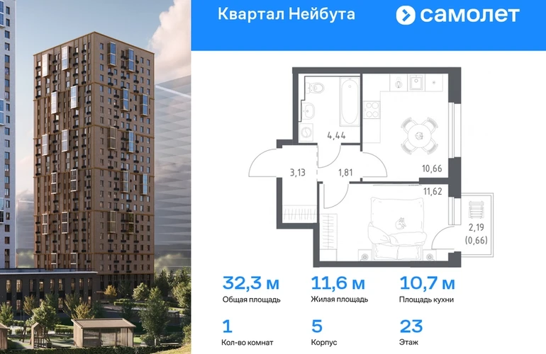 Предлагается 1-комнатная квартира комфорт-класса 32,32 кв.м в корпусе 5 на 23 этаже, в ЖК «Квартал Нейбута» Квартира с чистовой отделкой. Доступность дополнительных опций уточняйте у застройщика. Приобрести квартиру возможно по специальным акциям от застройщика, с текущими условиями акций можно ознакомиться в блоке “Акций”. Цена динамическая и может отличаться, уточняйте актуальность у застройщика. В новом «Квартале Нейбута» захочется освободить галерею телефона — чтобы вместить коллекцию по-настоящему захватывающих кадров. В объектив вашей камеры попадут зеленые сопки, бескрайнее небо и другие красоты Приморского края. Квартал находится в одном из районов Владивостока, откуда легко добраться в любую точку города. Дорога до центра города, морского и ж/д вокзалов займет 30 минут на машине или 45 минут на автобусе. Планировать отпуск тоже удобно — международный аэропорт находится в часе езды от дома. Скоро в квартале будет удобный выезд на улицы Нейбута и Фадеева, откуда можно попасть на трассу Патрокл — Седанка — Де-Фриз — Новый. А к старту первой очереди будет готов северный заезд с твердым покрытием. В квартале можно выйти из дома и оказаться в большом парке с экотропами и прогулочными зонами. Выходите на пробежку или на познавательную прогулку с детьми — можно долго рассматривать растения и искать их названия в интернете. Побродите по тропам для терренкура и обязательно побывайте на смотровых площадках — ваша коллекция впечатлений точно пополнится. Вечером отправляйтесь полюбоваться на вантовый мост в свете огней. Вид на него откроется из бухты Золотой Рог, дорога до которой займет 20 минут на авто. Чтобы решать все повседневные дела, даже не обязательно далеко уходить от дома. На первых этажах корпусов откроются салоны красоты, магазины, пункты выдачи и кафе. Забегайте за утренним латте, новой прической или продуктами к обеду. Юным жителям квартала тоже не придется долго шагать по своим важным делам. Рядом с кварталом находятся 3 детских сада, общеобразовательная и школа искусств и развивающий центр «Пчелкин дом». А скоро недалеко от проекта появится еще одна школа на 1100 учеников. Ее планируют строить в 2026 году. 26-этажные дома с отделкой золотистых и благородных коричневых оттенков гармонично впишутся в живописный дальневосточный пейзаж. Объем фасадам придают витражные балконы, с которых открываются виды на Уссурийский залив. Закрытые дворы без машин — маленький мир, вдохновленный природой Приморского края. Стены домов украшают дальневосточные лианы, крыши — пышные ковры из трав. Еще мы установим дождевые сады, которые скроют последствия даже самого сильного ливня. Во дворе найдется интересное занятие для всех жителей квартала. Взрослые смогут устраивать тренировки на свежем воздухе в спортивных зонах, дети будут целый день веселиться на игровых площадках. А для четвероногих питомцев мы предусмотрели специальные зоны для выгула. Возвращайтесь домой из отпуска с чемоданом сувениров или самокатом из парка. Мы отказались от ступенек и порогов у входов в подъезд, поэтому путь будет легким и удобным. Оставить коляску или велосипед можно на первом этаже, в специальном помещении. А бабушкины закрутки и сноуборд можно хранить в кладовых на подземном этаже. Среди разнообразных планировок вы наверняка найдете квартиру