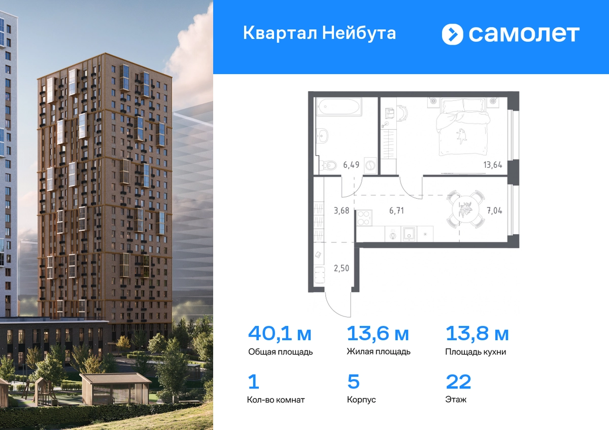 Предлагается 1-комнатная квартира комфорт-класса 40,06 кв.м в корпусе 5 на 22 этаже, в ЖК «Квартал Нейбута» Квартира с чистовой отделкой. Доступность дополнительных опций уточняйте у застройщика. Приобрести квартиру возможно по специальным акциям от застройщика, с текущими условиями акций можно ознакомиться в блоке “Акций”. Цена динамическая и может отличаться, уточняйте актуальность у застройщика. В новом «Квартале Нейбута» захочется освободить галерею телефона — чтобы вместить коллекцию по-настоящему захватывающих кадров. В объектив вашей камеры попадут зеленые сопки, бескрайнее небо и другие красоты Приморского края. Квартал находится в одном из районов Владивостока, откуда легко добраться в любую точку города. Дорога до центра города, морского и ж/д вокзалов займет 30 минут на машине или 45 минут на автобусе. Планировать отпуск тоже удобно — международный аэропорт находится в часе езды от дома. Скоро в квартале будет удобный выезд на улицы Нейбута и Фадеева, откуда можно попасть на трассу Патрокл — Седанка — Де-Фриз — Новый. А к старту первой очереди будет готов северный заезд с твердым покрытием. В квартале можно выйти из дома и оказаться в большом парке с экотропами и прогулочными зонами. Выходите на пробежку или на познавательную прогулку с детьми — можно долго рассматривать растения и искать их названия в интернете. Побродите по тропам для терренкура и обязательно побывайте на смотровых площадках — ваша коллекция впечатлений точно пополнится. Вечером отправляйтесь полюбоваться на вантовый мост в свете огней. Вид на него откроется из бухты Золотой Рог, дорога до которой займет 20 минут на авто. Чтобы решать все повседневные дела, даже не обязательно далеко уходить от дома. На первых этажах корпусов откроются салоны красоты, магазины, пункты выдачи и кафе. Забегайте за утренним латте, новой прической или продуктами к обеду. Юным жителям квартала тоже не придется долго шагать по своим важным делам. Рядом с кварталом находятся 3 детских сада, общеобразовательная и школа искусств и развивающий центр «Пчелкин дом». А скоро недалеко от проекта появится еще одна школа на 1100 учеников. Ее планируют строить в 2026 году. 26-этажные дома с отделкой золотистых и благородных коричневых оттенков гармонично впишутся в живописный дальневосточный пейзаж. Объем фасадам придают витражные балконы, с которых открываются виды на Уссурийский залив. Закрытые дворы без машин — маленький мир, вдохновленный природой Приморского края. Стены домов украшают дальневосточные лианы, крыши — пышные ковры из трав. Еще мы установим дождевые сады, которые скроют последствия даже самого сильного ливня. Во дворе найдется интересное занятие для всех жителей квартала. Взрослые смогут устраивать тренировки на свежем воздухе в спортивных зонах, дети будут целый день веселиться на игровых площадках. А для четвероногих питомцев мы предусмотрели специальные зоны для выгула. Возвращайтесь домой из отпуска с чемоданом сувениров или самокатом из парка. Мы отказались от ступенек и порогов у входов в подъезд, поэтому путь будет легким и удобным. Оставить коляску или велосипед можно на первом этаже, в специальном помещении. А бабушкины закрутки и сноуборд можно хранить в кладовых на подземном этаже. Среди разнообразных планировок вы наверняка найдете квартиру