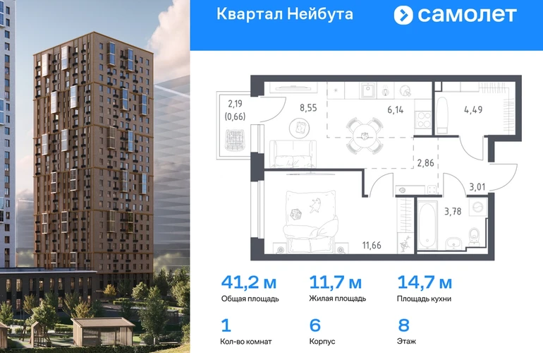 Предлагается 1-комнатная квартира комфорт-класса 41,15 кв.м в корпусе 6 на 8 этаже, в ЖК «Квартал Нейбута» Квартира с предчистовой отделкой. Доступность дополнительных опций уточняйте у застройщика. Приобрести квартиру возможно по специальным акциям от застройщика, с текущими условиями акций можно ознакомиться в блоке “Акций”. Цена динамическая и может отличаться, уточняйте актуальность у застройщика. В новом «Квартале Нейбута» захочется освободить галерею телефона — чтобы вместить коллекцию по-настоящему захватывающих кадров. В объектив вашей камеры попадут зеленые сопки, бескрайнее небо и другие красоты Приморского края. Квартал находится в одном из районов Владивостока, откуда легко добраться в любую точку города. Дорога до центра города, морского и ж/д вокзалов займет 30 минут на машине или 45 минут на автобусе. Планировать отпуск тоже удобно — международный аэропорт находится в часе езды от дома. Скоро в квартале будет удобный выезд на улицы Нейбута и Фадеева, откуда можно попасть на трассу Патрокл — Седанка — Де-Фриз — Новый. А к старту первой очереди будет готов северный заезд с твердым покрытием. В квартале можно выйти из дома и оказаться в большом парке с экотропами и прогулочными зонами. Выходите на пробежку или на познавательную прогулку с детьми — можно долго рассматривать растения и искать их названия в интернете. Побродите по тропам для терренкура и обязательно побывайте на смотровых площадках — ваша коллекция впечатлений точно пополнится. Вечером отправляйтесь полюбоваться на вантовый мост в свете огней. Вид на него откроется из бухты Золотой Рог, дорога до которой займет 20 минут на авто. Чтобы решать все повседневные дела, даже не обязательно далеко уходить от дома. На первых этажах корпусов откроются салоны красоты, магазины, пункты выдачи и кафе. Забегайте за утренним латте, новой прической или продуктами к обеду. Юным жителям квартала тоже не придется долго шагать по своим важным делам. Рядом с кварталом находятся 3 детских сада, общеобразовательная и школа искусств и развивающий центр «Пчелкин дом». А скоро недалеко от проекта появится еще одна школа на 1100 учеников. Ее планируют строить в 2026 году. 26-этажные дома с отделкой золотистых и благородных коричневых оттенков гармонично впишутся в живописный дальневосточный пейзаж. Объем фасадам придают витражные балконы, с которых открываются виды на Уссурийский залив. Закрытые дворы без машин — маленький мир, вдохновленный природой Приморского края. Стены домов украшают дальневосточные лианы, крыши — пышные ковры из трав. Еще мы установим дождевые сады, которые скроют последствия даже самого сильного ливня. Во дворе найдется интересное занятие для всех жителей квартала. Взрослые смогут устраивать тренировки на свежем воздухе в спортивных зонах, дети будут целый день веселиться на игровых площадках. А для четвероногих питомцев мы предусмотрели специальные зоны для выгула. Возвращайтесь домой из отпуска с чемоданом сувениров или самокатом из парка. Мы отказались от ступенек и порогов у входов в подъезд, поэтому путь будет легким и удобным. Оставить коляску или велосипед можно на первом этаже, в специальном помещении. А бабушкины закрутки и сноуборд можно хранить в кладовых на подземном этаже. Среди разнообразных планировок вы наверняка найдете квар