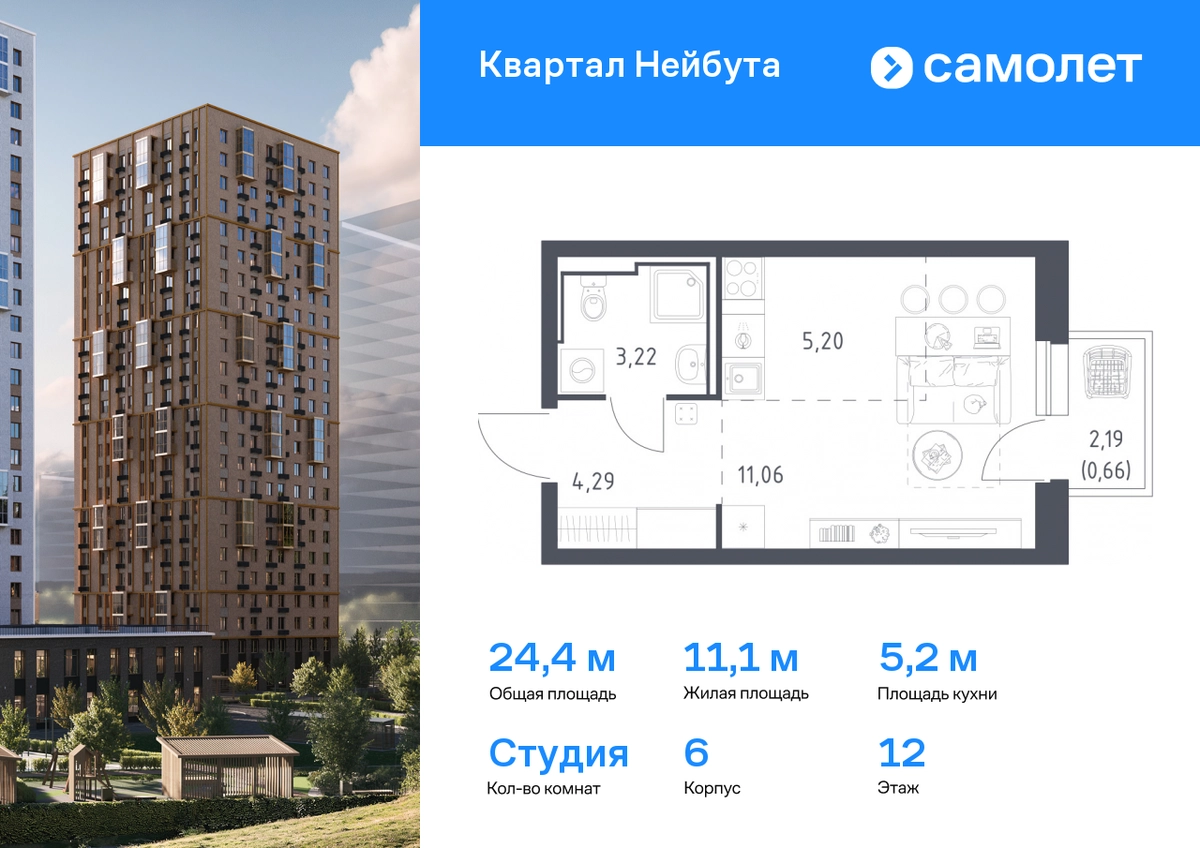 Предлагается квартира студия комфорт-класса 24,43 кв.м в корпусе 6 на 12 этаже, в ЖК «Квартал Нейбута» Квартира с предчистовой отделкой. Доступность дополнительных опций уточняйте у застройщика. Приобрести квартиру возможно по специальным акциям от застройщика, с текущими условиями акций можно ознакомиться в блоке «Акций». Цена динамическая и может отличаться, уточняйте актуальность у застройщика. В новом «Квартале Нейбута» захочется освободить галерею телефона — чтобы вместить коллекцию по-настоящему захватывающих кадров. В объектив вашей камеры попадут зеленые сопки, бескрайнее небо и другие красоты Приморского края. Квартал находится в одном из районов Владивостока, откуда легко добраться в любую точку города. Дорога до центра города, морского и ж/д вокзалов займет 30 минут на машине или 45 минут на автобусе. Планировать отпуск тоже удобно — международный аэропорт находится в часе езды от дома. Скоро в квартале будет удобный выезд на улицы Нейбута и Фадеева, откуда можно попасть на трассу Патрокл — Седанка — Де-Фриз — Новый. А к старту первой очереди будет готов северный заезд с твердым покрытием. В квартале можно выйти из дома и оказаться в большом парке с экотропами и прогулочными зонами. Выходите на пробежку или на познавательную прогулку с детьми — можно долго рассматривать растения и искать их названия в интернете. Побродите по тропам для терренкура и обязательно побывайте на смотровых площадках — ваша коллекция впечатлений точно пополнится. Вечером отправляйтесь полюбоваться на вантовый мост в свете огней. Вид на него откроется из бухты Золотой Рог, дорога до которой займет 20 минут на авто. Чтобы решать все повседневные дела, даже не обязательно далеко уходить от дома. На первых этажах корпусов откроются салоны красоты, магазины, пункты выдачи и кафе. Забегайте за утренним латте, новой прической или продуктами к обеду. Юным жителям квартала тоже не придется долго шагать по своим важным делам. Рядом с кварталом находятся 3 детских сада, общеобразовательная и школа искусств и развивающий центр «Пчелкин дом». А скоро недалеко от проекта появится еще одна школа на 1100 учеников. Ее планируют строить в 2026 году. 26-этажные дома с отделкой золотистых и благородных коричневых оттенков гармонично впишутся в живописный дальневосточный пейзаж. Объем фасадам придают витражные балконы, с которых открываются виды на Уссурийский залив. Закрытые дворы без машин — маленький мир, вдохновленный природой Приморского края. Стены домов украшают дальневосточные лианы, крыши — пышные ковры из трав. Еще мы установим дождевые сады, которые скроют последствия даже самого сильного ливня. Во дворе найдется интересное занятие для всех жителей квартала. Взрослые смогут устраивать тренировки на свежем воздухе в спортивных зонах, дети будут целый день веселиться на игровых площадках. А для четвероногих питомцев мы предусмотрели специальные зоны для выгула. Возвращайтесь домой из отпуска с чемоданом сувениров или самокатом из парка. Мы отказались от ступенек и порогов у входов в подъезд, поэтому путь будет легким и удобным. Оставить коляску или велосипед можно на первом этаже, в специальном помещении. А бабушкины закрутки и сноуборд можно хранить в кладовых на подземном этаже. Среди разнообразных планировок вы наверняка найдете квартиру 