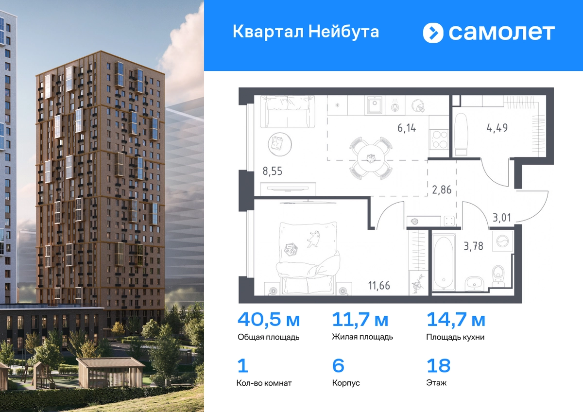 Предлагается 1-комнатная квартира комфорт-класса 40,49 кв.м в корпусе 6 на 18 этаже, в ЖК «Квартал Нейбута» Квартира с предчистовой отделкой. Доступность дополнительных опций уточняйте у застройщика. Приобрести квартиру возможно по специальным акциям от застройщика, с текущими условиями акций можно ознакомиться в блоке «Акций». Цена динамическая и может отличаться, уточняйте актуальность у застройщика. В новом «Квартале Нейбута» захочется освободить галерею телефона — чтобы вместить коллекцию по-настоящему захватывающих кадров. В объектив вашей камеры попадут зеленые сопки, бескрайнее небо и другие красоты Приморского края. Квартал находится в одном из районов Владивостока, откуда легко добраться в любую точку города. Дорога до центра города, морского и ж/д вокзалов займет 30 минут на машине или 45 минут на автобусе. Планировать отпуск тоже удобно — международный аэропорт находится в часе езды от дома. Скоро в квартале будет удобный выезд на улицы Нейбута и Фадеева, откуда можно попасть на трассу Патрокл — Седанка — Де-Фриз — Новый. А к старту первой очереди будет готов северный заезд с твердым покрытием. В квартале можно выйти из дома и оказаться в большом парке с экотропами и прогулочными зонами. Выходите на пробежку или на познавательную прогулку с детьми — можно долго рассматривать растения и искать их названия в интернете. Побродите по тропам для терренкура и обязательно побывайте на смотровых площадках — ваша коллекция впечатлений точно пополнится. Вечером отправляйтесь полюбоваться на вантовый мост в свете огней. Вид на него откроется из бухты Золотой Рог, дорога до которой займет 20 минут на авто. Чтобы решать все повседневные дела, даже не обязательно далеко уходить от дома. На первых этажах корпусов откроются салоны красоты, магазины, пункты выдачи и кафе. Забегайте за утренним латте, новой прической или продуктами к обеду. Юным жителям квартала тоже не придется долго шагать по своим важным делам. Рядом с кварталом находятся 3 детских сада, общеобразовательная и школа искусств и развивающий центр «Пчелкин дом». А скоро недалеко от проекта появится еще одна школа на 1100 учеников. Ее планируют строить в 2026 году. 26-этажные дома с отделкой золотистых и благородных коричневых оттенков гармонично впишутся в живописный дальневосточный пейзаж. Объем фасадам придают витражные балконы, с которых открываются виды на Уссурийский залив. Закрытые дворы без машин — маленький мир, вдохновленный природой Приморского края. Стены домов украшают дальневосточные лианы, крыши — пышные ковры из трав. Еще мы установим дождевые сады, которые скроют последствия даже самого сильного ливня. Во дворе найдется интересное занятие для всех жителей квартала. Взрослые смогут устраивать тренировки на свежем воздухе в спортивных зонах, дети будут целый день веселиться на игровых площадках. А для четвероногих питомцев мы предусмотрели специальные зоны для выгула. Возвращайтесь домой из отпуска с чемоданом сувениров или самокатом из парка. Мы отказались от ступенек и порогов у входов в подъезд, поэтому путь будет легким и удобным. Оставить коляску или велосипед можно на первом этаже, в специальном помещении. А бабушкины закрутки и сноуборд можно хранить в кладовых на подземном этаже. Среди разнообразных планировок вы наверняка найдете кварт
