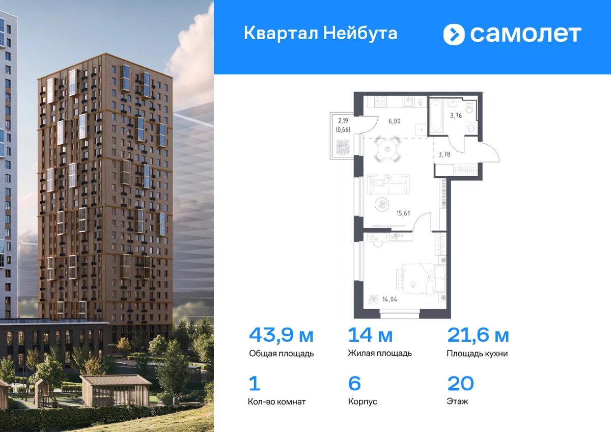 Строим кварталы для жизни с заботой о будущем. Предлагается 1-комнатная квартира комфорт-класса 43,85 кв.м в корпусе 6 на 20 этаже, в ЖК «Квартал Нейбута» Квартира с предчистовой отделкой. Доступность дополнительных опций уточняйте у застройщика. Приобрести квартиру возможно по специальным акциям от застройщика, с текущими условиями акций можно ознакомиться в блоке «Акций». Цена динамическая и может отличаться, уточняйте актуальность у застройщика. «Квартал Нейбута» находится в Ленинском районе Владивостока. Дорога до центра города, морского и ж/д вокзалов займет 30 минут на машине или 45 минут на автобусе. Международный аэропорт находится в часе езды от дома. Скоро в квартале будет удобный выезд, откуда можно попасть на трассу Патрокл — Седанка — Де-Фриз — Новый. 26-этажные дома с отделкой золотистых и благородных коричневых оттенков гармонично впишутся в живописный дальневосточный пейзаж. Объем фасадам придают витражные балконы. Закрытые дворы без машин — маленький мир, вдохновленный природой Приморского края. Во дворе найдется занятие для всех жителей квартала. Взрослые смогут устраивать тренировки в спортивных зонах, дети будут веселиться на игровых площадках. А для четвероногих питомцев мы предусмотрели специальные зоны для выгула. Мы отказались от ступенек и порогов у входов в подъезд. Оставить коляску или велосипед можно на первом этаже, в специальном помещении. На подземном этаже предусмотрены кладовые.#yan19-2r1790374#О застройщике