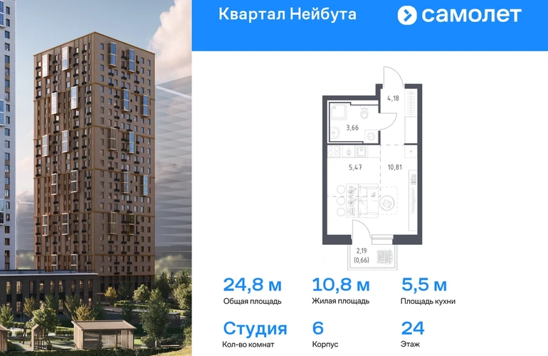 Предлагается квартира студия комфорт-класса 24,78 кв.м в корпусе 6 на 24 этаже, в ЖК «Квартал Нейбута» Квартира с предчистовой отделкой. Доступность дополнительных опций уточняйте у застройщика. Приобрести квартиру возможно по специальным акциям от застройщика, с текущими условиями акций можно ознакомиться в блоке “Акций”. Цена динамическая и может отличаться, уточняйте актуальность у застройщика. В новом «Квартале Нейбута» захочется освободить галерею телефона — чтобы вместить коллекцию по-настоящему захватывающих кадров. В объектив вашей камеры попадут зеленые сопки, бескрайнее небо и другие красоты Приморского края. Квартал находится в одном из районов Владивостока, откуда легко добраться в любую точку города. Дорога до центра города, морского и ж/д вокзалов займет 30 минут на машине или 45 минут на автобусе. Планировать отпуск тоже удобно — международный аэропорт находится в часе езды от дома. Скоро в квартале будет удобный выезд на улицы Нейбута и Фадеева, откуда можно попасть на трассу Патрокл — Седанка — Де-Фриз — Новый. А к старту первой очереди будет готов северный заезд с твердым покрытием. В квартале можно выйти из дома и оказаться в большом парке с экотропами и прогулочными зонами. Выходите на пробежку или на познавательную прогулку с детьми — можно долго рассматривать растения и искать их названия в интернете. Побродите по тропам для терренкура и обязательно побывайте на смотровых площадках — ваша коллекция впечатлений точно пополнится. Вечером отправляйтесь полюбоваться на вантовый мост в свете огней. Вид на него откроется из бухты Золотой Рог, дорога до которой займет 20 минут на авто. Чтобы решать все повседневные дела, даже не обязательно далеко уходить от дома. На первых этажах корпусов откроются салоны красоты, магазины, пункты выдачи и кафе. Забегайте за утренним латте, новой прической или продуктами к обеду. Юным жителям квартала тоже не придется долго шагать по своим важным делам. Рядом с кварталом находятся 3 детских сада, общеобразовательная и школа искусств и развивающий центр «Пчелкин дом». А скоро недалеко от проекта появится еще одна школа на 1100 учеников. Ее планируют строить в 2026 году. 26-этажные дома с отделкой золотистых и благородных коричневых оттенков гармонично впишутся в живописный дальневосточный пейзаж. Объем фасадам придают витражные балконы, с которых открываются виды на Уссурийский залив. Закрытые дворы без машин — маленький мир, вдохновленный природой Приморского края. Стены домов украшают дальневосточные лианы, крыши — пышные ковры из трав. Еще мы установим дождевые сады, которые скроют последствия даже самого сильного ливня. Во дворе найдется интересное занятие для всех жителей квартала. Взрослые смогут устраивать тренировки на свежем воздухе в спортивных зонах, дети будут целый день веселиться на игровых площадках. А для четвероногих питомцев мы предусмотрели специальные зоны для выгула. Возвращайтесь домой из отпуска с чемоданом сувениров или самокатом из парка. Мы отказались от ступенек и порогов у входов в подъезд, поэтому путь будет легким и удобным. Оставить коляску или велосипед можно на первом этаже, в специальном помещении. А бабушкины закрутки и сноуборд можно хранить в кладовых на подземном этаже. Среди разнообразных планировок вы наверняка найдете квартиру