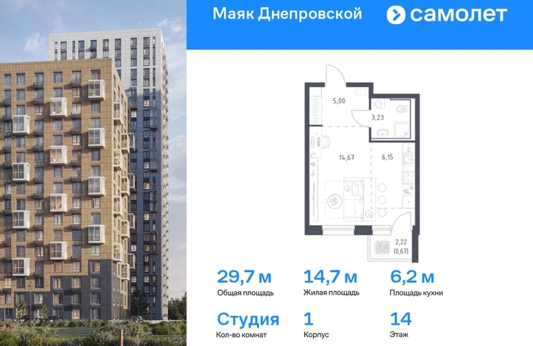 Строим кварталы для жизни с заботой о будущем. Предлагается квартира студия комфорт-класса 29,7 кв.м в корпусе 1 на 14 этаже, в ЖК «Маяк Днепровской» Квартира с предчистовой отделкой. Доступность дополнительных опций уточняйте у застройщика. Приобрести квартиру возможно по специальным акциям от застройщика, с текущими условиями акций можно ознакомиться в блоке «Акций». Цена динамическая и может отличаться, уточняйте актуальность у застройщика. «Маяк Днепровской» — это маленький город с домами высотой от 17 до 30 этажей. Мы строим современные здания со стилобатами и террасами, которые отвечают архитектурным трендам, но при этом гармонично вписываются в окружающие пейзажи. Переменная этажность домов повторяет уникальный дальневосточный ландшафт, а оттенки фасадов перекликаются с красками природы. Здесь вы будете любоваться живописными закатами и встречать рассветы с панорамного балкона. #yan19-2r1718787#О застройщике