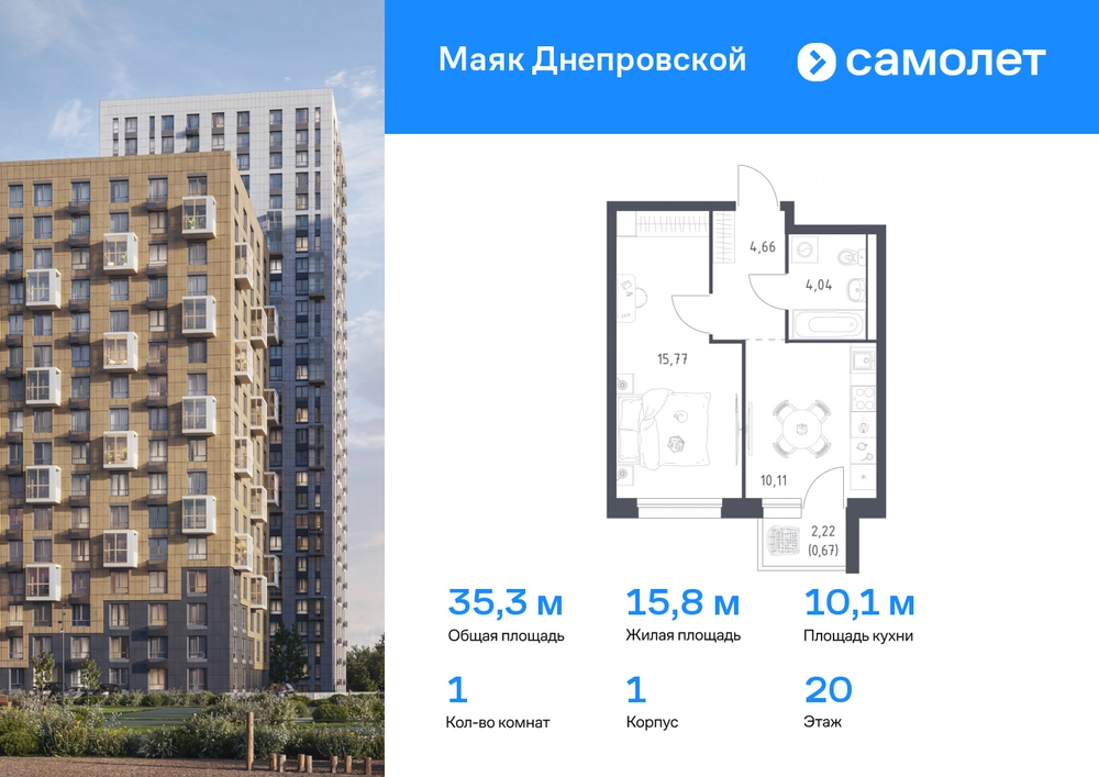 Предлагается 1-комнатная квартира комфорт-класса 35,25 кв.м в корпусе 1 на 20 этаже, в ЖК «Маяк Днепровской» Квартира с предчистовой отделкой. Доступность дополнительных опций уточняйте у застройщика. Планировкой предусмотрены: Прихожая - 4,66 м² Кухня - 10,11 м² Жилая_комната_1 - 15,77 м² СУ_1 - 4,04 м² Балкон_1 - 0,67 м² Приобрести квартиру возможно по специальным акциям от застройщика, с текущими условиями акций можно ознакомиться в блоке “Акций”. Цена динамическая и может отличаться, уточняйте актуальность у застройщика. "Маяк Днепровской" — это маленький город с домами высотой от 17 до 30 этажей. Мы строим современные здания со стилобатами и террасами, которые отвечают архитектурным трендам, но при этом гармонично вписываются в окружающие пейзажи. Переменная этажность домов повторяет уникальный дальневосточный ландшафт, а оттенки фасадов перекликаются с красками природы. Здесь вы будете любоваться живописными закатами и встречать рассветы с панорамного балкона. #yan19-2r1761228#О застройщике