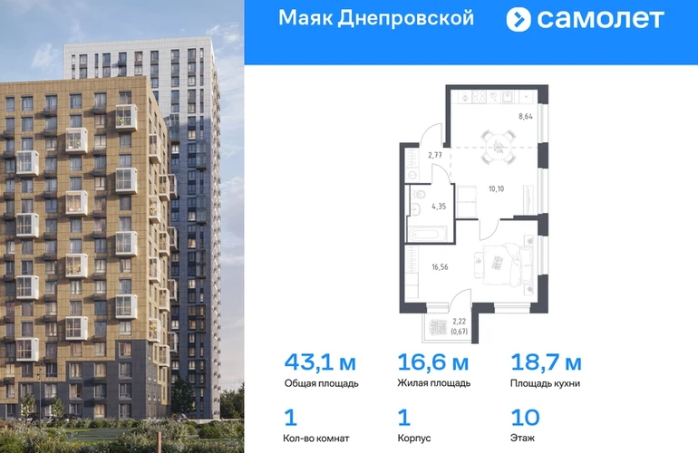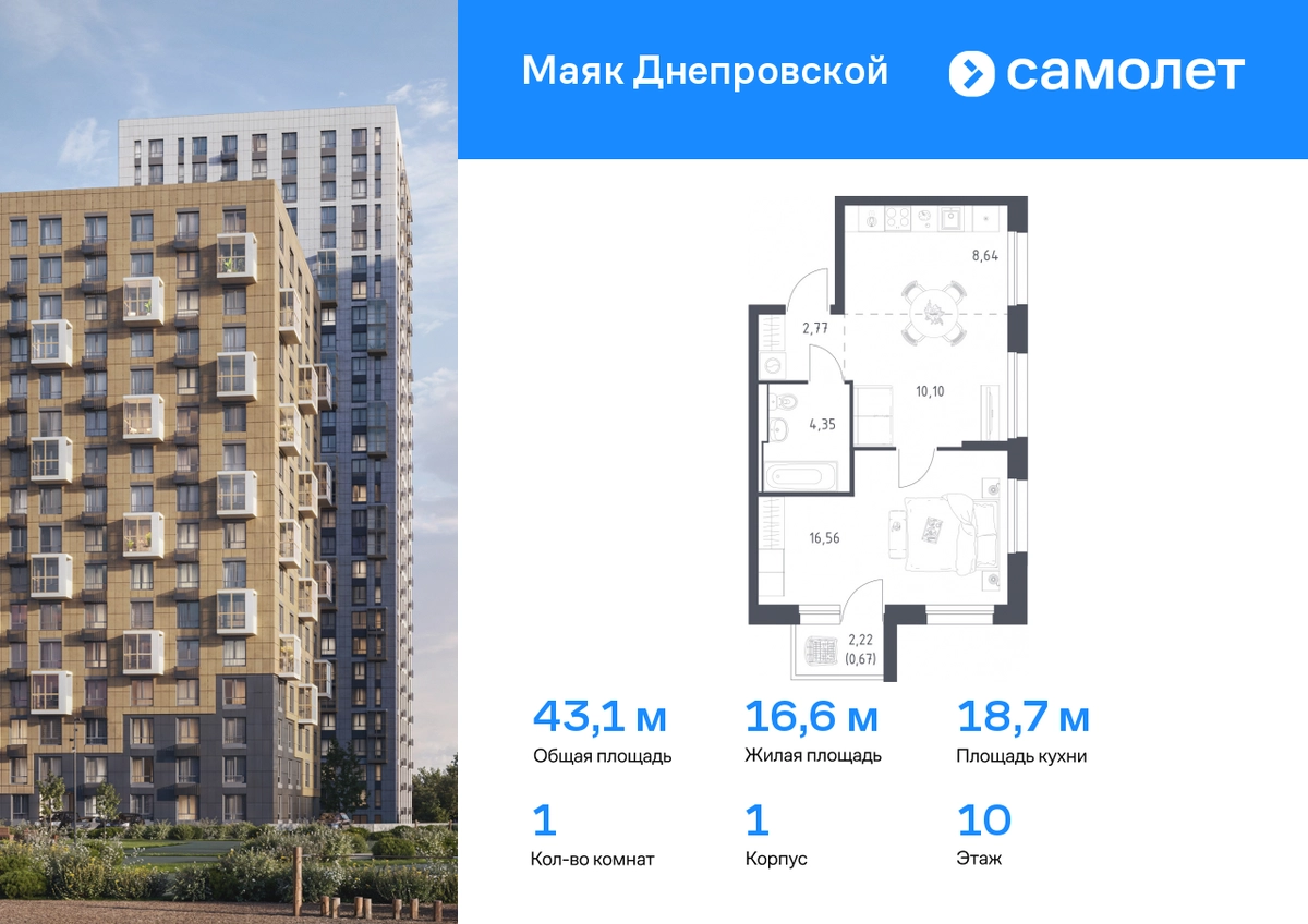 Строим кварталы для жизни с заботой о будущем. Предлагается 1-комнатная квартира комфорт-класса 43,15 кв.м в корпусе 1 на 10 этаже, в ЖК «Маяк Днепровской» Квартира с чистовой отделкой. Доступность дополнительных опций уточняйте у застройщика. Приобрести квартиру возможно по специальным акциям от застройщика, с текущими условиями акций можно ознакомиться в блоке «Акций». Цена динамическая и может отличаться, уточняйте актуальность у застройщика. «Маяк Днепровской» — это маленький город с домами высотой от 17 до 30 этажей. Мы строим современные здания со стилобатами и террасами, которые отвечают архитектурным трендам, но при этом гармонично вписываются в окружающие пейзажи. Переменная этажность домов повторяет уникальный дальневосточный ландшафт, а оттенки фасадов перекликаются с красками природы. Здесь вы будете любоваться живописными закатами и встречать рассветы с панорамного балкона. #yan19-2r1777108#О застройщике