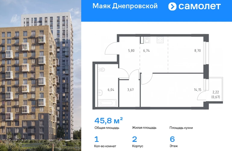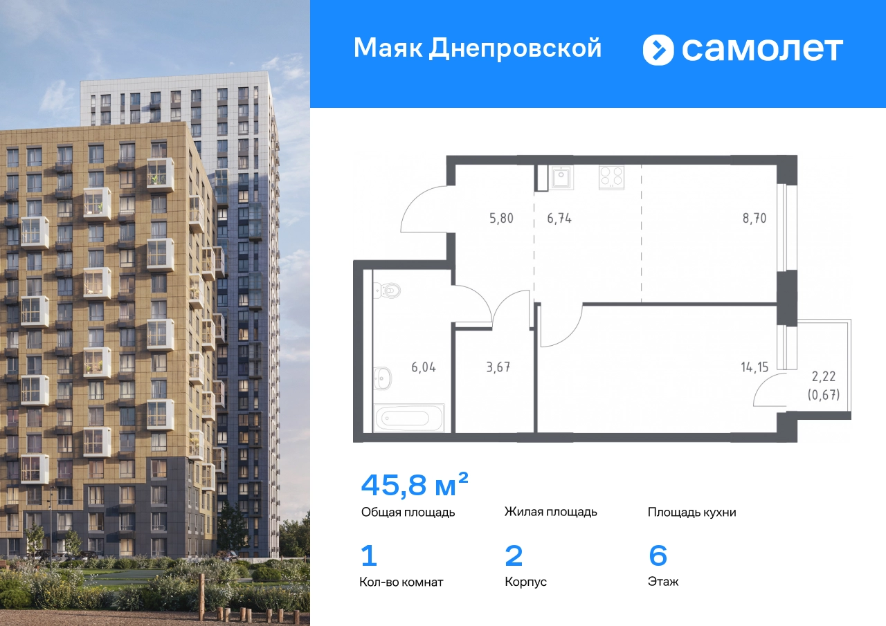 Строим кварталы для жизни с заботой о будущем. Предлагается 1-комнатная квартира комфорт-класса 45,77 кв.м в корпусе 2 на 6 этаже, в ЖК «Маяк Днепровской» Квартира без отделки. Доступность опции «отделка» и возможность комплектации мебелью и декором уточняйте у застройщика. Приобрести квартиру возможно по специальным акциям от застройщика, с текущими условиями акций можно ознакомиться в блоке «Акций». Цена динамическая и может отличаться, уточняйте актуальность у застройщика. «Маяк Днепровской» — это маленький город с домами высотой от 17 до 30 этажей. Мы строим современные здания со стилобатами и террасами, которые отвечают архитектурным трендам, но при этом гармонично вписываются в окружающие пейзажи. Переменная этажность домов повторяет уникальный дальневосточный ландшафт, а оттенки фасадов перекликаются с красками природы. Здесь вы будете любоваться живописными закатами и встречать рассветы с панорамного балкона. #yan19-2r1815880#О застройщике