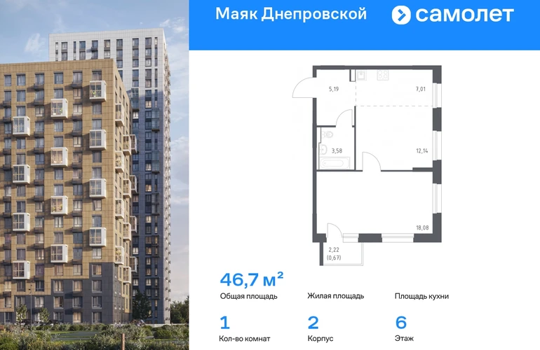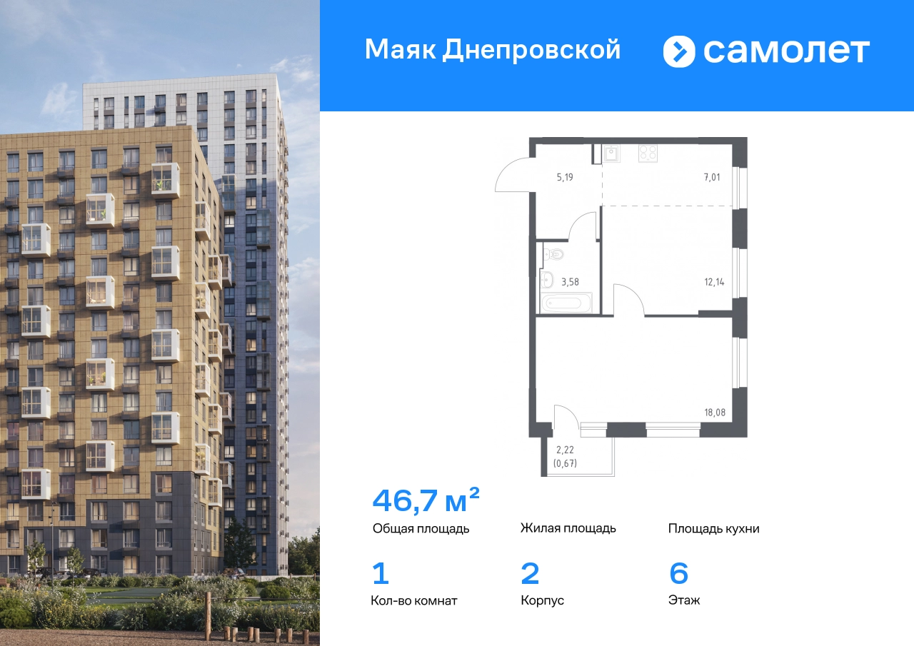 Строим кварталы для жизни с заботой о будущем. Предлагается 1-комнатная квартира комфорт-класса 46,67 кв.м в корпусе 2 на 6 этаже, в ЖК «Маяк Днепровской» Квартира без отделки. Доступность опции «отделка» и возможность комплектации мебелью и декором уточняйте у застройщика. Приобрести квартиру возможно по специальным акциям от застройщика, с текущими условиями акций можно ознакомиться в блоке «Акций». Цена динамическая и может отличаться, уточняйте актуальность у застройщика. «Маяк Днепровской» — это маленький город с домами высотой от 17 до 30 этажей. Мы строим современные здания со стилобатами и террасами, которые отвечают архитектурным трендам, но при этом гармонично вписываются в окружающие пейзажи. Переменная этажность домов повторяет уникальный дальневосточный ландшафт, а оттенки фасадов перекликаются с красками природы. Здесь вы будете любоваться живописными закатами и встречать рассветы с панорамного балкона. #yan19-2r1815881#О застройщике