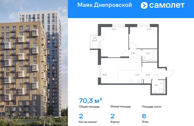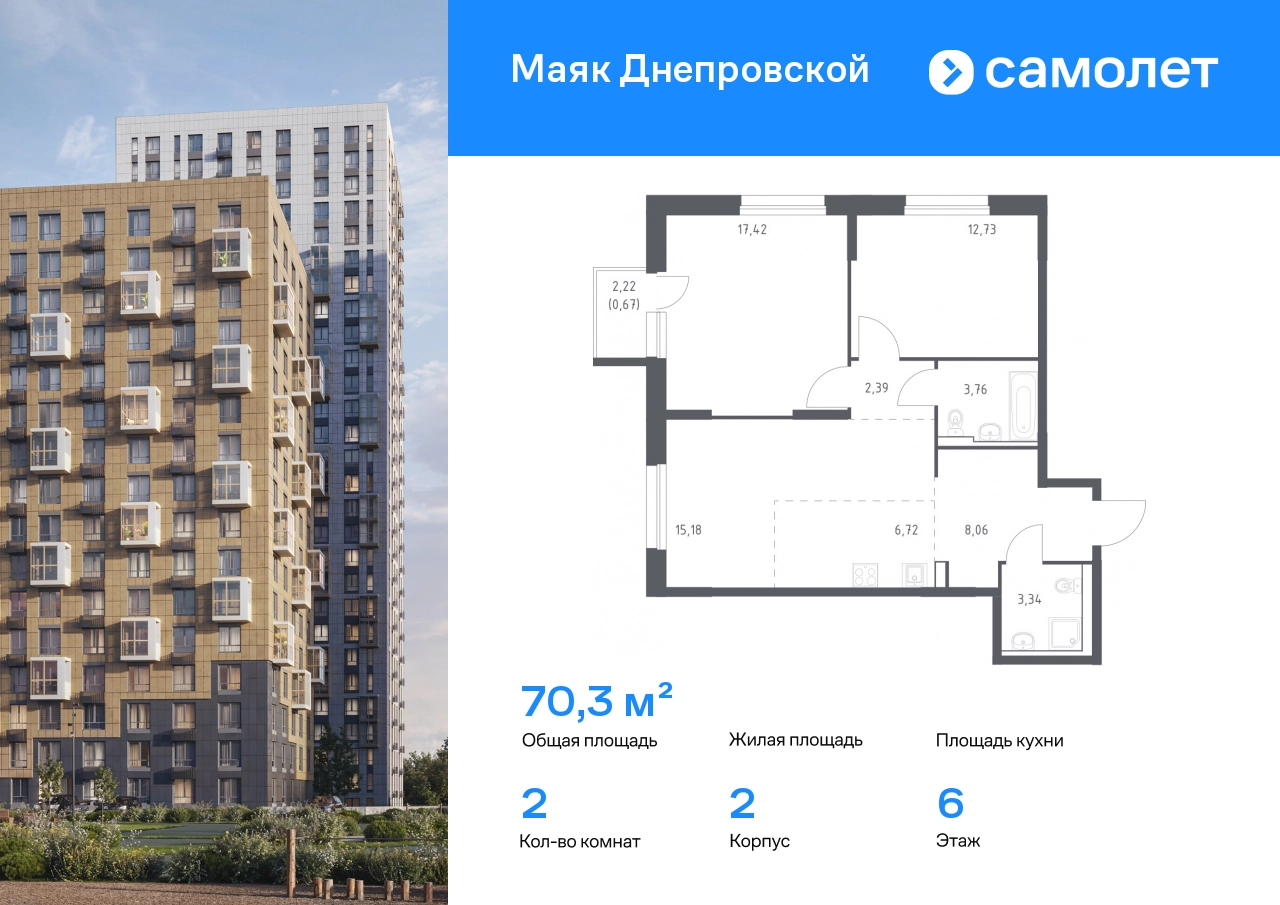 Строим кварталы для жизни с заботой о будущем. Предлагается 2-комнатная квартира комфорт-класса 70,27 кв.м в корпусе 2 на 6 этаже, в ЖК «Маяк Днепровской» Квартира без отделки. Доступность опции «отделка» и возможность комплектации мебелью и декором уточняйте у застройщика. Приобрести квартиру возможно по специальным акциям от застройщика, с текущими условиями акций можно ознакомиться в блоке «Акций». Цена динамическая и может отличаться, уточняйте актуальность у застройщика. «Маяк Днепровской» — это маленький город с домами высотой от 17 до 30 этажей. Мы строим современные здания со стилобатами и террасами, которые отвечают архитектурным трендам, но при этом гармонично вписываются в окружающие пейзажи. Переменная этажность домов повторяет уникальный дальневосточный ландшафт, а оттенки фасадов перекликаются с красками природы. Здесь вы будете любоваться живописными закатами и встречать рассветы с панорамного балкона. #yan19-2r1815883#О застройщике
