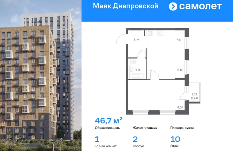 Строим кварталы для жизни с заботой о будущем. Предлагается 1-комнатная квартира комфорт-класса 46,67 кв.м в корпусе 2 на 10 этаже, в ЖК «Маяк Днепровской» Квартира с чистовой отделкой. Доступность дополнительных опций уточняйте у застройщика. Приобрести квартиру возможно по специальным акциям от застройщика, с текущими условиями акций можно ознакомиться в блоке «Акций». Цена динамическая и может отличаться, уточняйте актуальность у застройщика. «Маяк Днепровской» — это маленький город с домами высотой от 17 до 30 этажей. Мы строим современные здания со стилобатами и террасами, которые отвечают архитектурным трендам, но при этом гармонично вписываются в окружающие пейзажи. Переменная этажность домов повторяет уникальный дальневосточный ландшафт, а оттенки фасадов перекликаются с красками природы. Здесь вы будете любоваться живописными закатами и встречать рассветы с панорамного балкона. #yan19-2r1815892#О застройщике