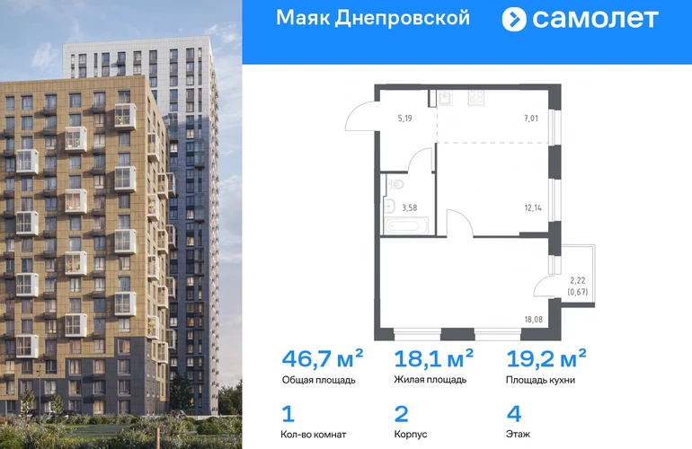 Строим кварталы для жизни с заботой о будущем. Предлагается 1-комнатная квартира комфорт-класса 46,67 кв.м в корпусе 2 на 4 этаже, в ЖК «Маяк Днепровской» Квартира без отделки. Доступность опции «отделка» и возможность комплектации мебелью и декором уточняйте у застройщика. Приобрести квартиру возможно по специальным акциям от застройщика, с текущими условиями акций можно ознакомиться в блоке «Акций». Цена динамическая и может отличаться, уточняйте актуальность у застройщика. «Маяк Днепровской» — это маленький город с домами высотой от 17 до 30 этажей. Мы строим современные здания со стилобатами и террасами, которые отвечают архитектурным трендам, но при этом гармонично вписываются в окружающие пейзажи. Переменная этажность домов повторяет уникальный дальневосточный ландшафт, а оттенки фасадов перекликаются с красками природы. Здесь вы будете любоваться живописными закатами и встречать рассветы с панорамного балкона. #yan19-2r1819020#О застройщике