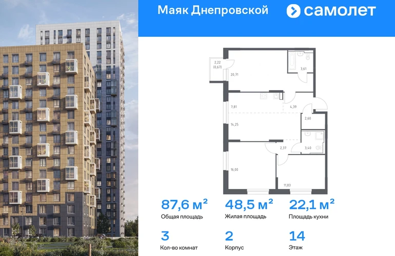 Строим кварталы для жизни с заботой о будущем. Предлагается 3-комнатная квартира комфорт-класса 87,64 кв.м в корпусе 2 на 14 этаже, в ЖК «Маяк Днепровской» Квартира с предчистовой отделкой. Доступность дополнительных опций уточняйте у застройщика. Приобрести квартиру возможно по специальным акциям от застройщика, с текущими условиями акций можно ознакомиться в блоке «Акций». Цена динамическая и может отличаться, уточняйте актуальность у застройщика. «Маяк Днепровской» — это маленький город с домами высотой от 17 до 30 этажей. Мы строим современные здания со стилобатами и террасами, которые отвечают архитектурным трендам, но при этом гармонично вписываются в окружающие пейзажи. Переменная этажность домов повторяет уникальный дальневосточный ландшафт, а оттенки фасадов перекликаются с красками природы. Здесь вы будете любоваться живописными закатами и встречать рассветы с панорамного балкона. #yan19-2r1819049#О застройщике