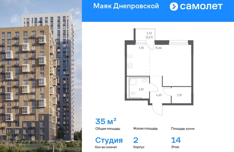 Строим кварталы для жизни с заботой о будущем. Предлагается квартира студия комфорт-класса 34,98 кв.м в корпусе 2 на 14 этаже, в ЖК «Маяк Днепровской» Квартира с предчистовой отделкой. Доступность дополнительных опций уточняйте у застройщика. Приобрести квартиру возможно по специальным акциям от застройщика, с текущими условиями акций можно ознакомиться в блоке «Акций». Цена динамическая и может отличаться, уточняйте актуальность у застройщика. «Маяк Днепровской» — это маленький город с домами высотой от 17 до 30 этажей. Мы строим современные здания со стилобатами и террасами, которые отвечают архитектурным трендам, но при этом гармонично вписываются в окружающие пейзажи. Переменная этажность домов повторяет уникальный дальневосточный ландшафт, а оттенки фасадов перекликаются с красками природы. Здесь вы будете любоваться живописными закатами и встречать рассветы с панорамного балкона. #yan19-2r1819055#О застройщике