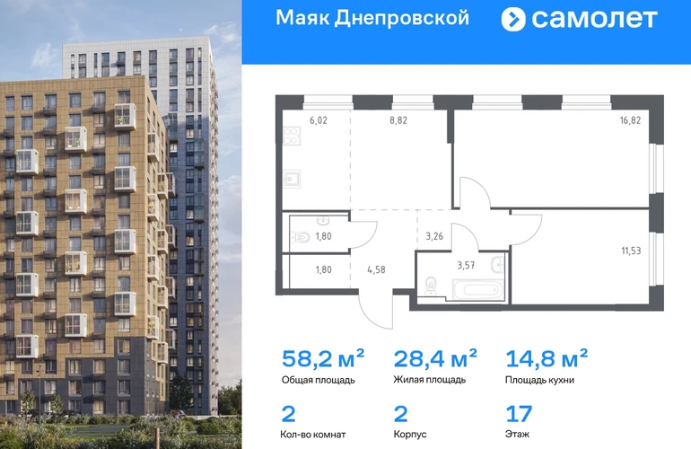 Строим кварталы для жизни с заботой о будущем. Предлагается 2-комнатная квартира комфорт-класса 58,2 кв.м в корпусе 2 на 17 этаже, в ЖК «Маяк Днепровской» Квартира с предчистовой отделкой. Доступность дополнительных опций уточняйте у застройщика. Приобрести квартиру возможно по специальным акциям от застройщика, с текущими условиями акций можно ознакомиться в блоке «Акций». Цена динамическая и может отличаться, уточняйте актуальность у застройщика. «Маяк Днепровской» — это маленький город с домами высотой от 17 до 30 этажей. Мы строим современные здания со стилобатами и террасами, которые отвечают архитектурным трендам, но при этом гармонично вписываются в окружающие пейзажи. Переменная этажность домов повторяет уникальный дальневосточный ландшафт, а оттенки фасадов перекликаются с красками природы. Здесь вы будете любоваться живописными закатами и встречать рассветы с панорамного балкона. #yan19-2r1819061#О застройщике