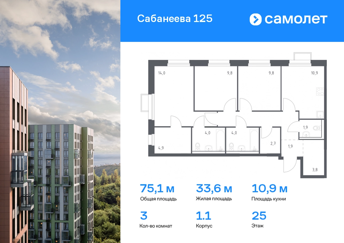 Предлагается 3-комнатная квартира комфорт-класса 75,1 кв.м в корпусе 1.1 на 25 этаже, в ЖК «Сабанеева 125» Квартира без отделки. Доступность опции «отделка» и возможность комплектации мебелью и декором уточняйте у застройщика. Приобрести квартиру возможно по специальным акциям от застройщика, с текущими условиями акций можно ознакомиться в блоке «Акций». Цена динамическая и может отличаться, уточняйте актуальность у застройщика. В жилом комплексе «Сабанеева 125» вы ежедневно будете наслаждаться видами сопок. Холмистый рельеф защищает территорию от ветра. Комплекс расположен в Первореченском районе Владивостока, всего в 20 минутах на машине до центра города. На первых этажах откроются супермаркеты, кафе и пекарни. Для малышей — детский сад в 2 минутах пешком и школа в 10 минутах. За 6 минут можно доехать до Нагорного парка, а за 15 минут — до набережной Цесаревича с панорамой Золотого моста. Комплекс состоит из 3 монолитных домов высотой 25 этажей с фасадами, дизайн которых вдохновлен птицами Дальнего Востока. Дворы оформлены как сад с дальневосточной флорой, есть смотровые площадки, скалодром, перголы и игровые зоны для детей. Подземный паркинг — трехуровневый. В сквозные подъезды без ступеней и с помещением для колясок удобно заходить. В жилом комплексе «Сабанеева 125» есть квартиры с индивидуальными зелеными террасами, увеличенными окнами и панорамными балконами для чаепитий с видом на сопки и залив.#yan19-2r1609813#О застройщике
