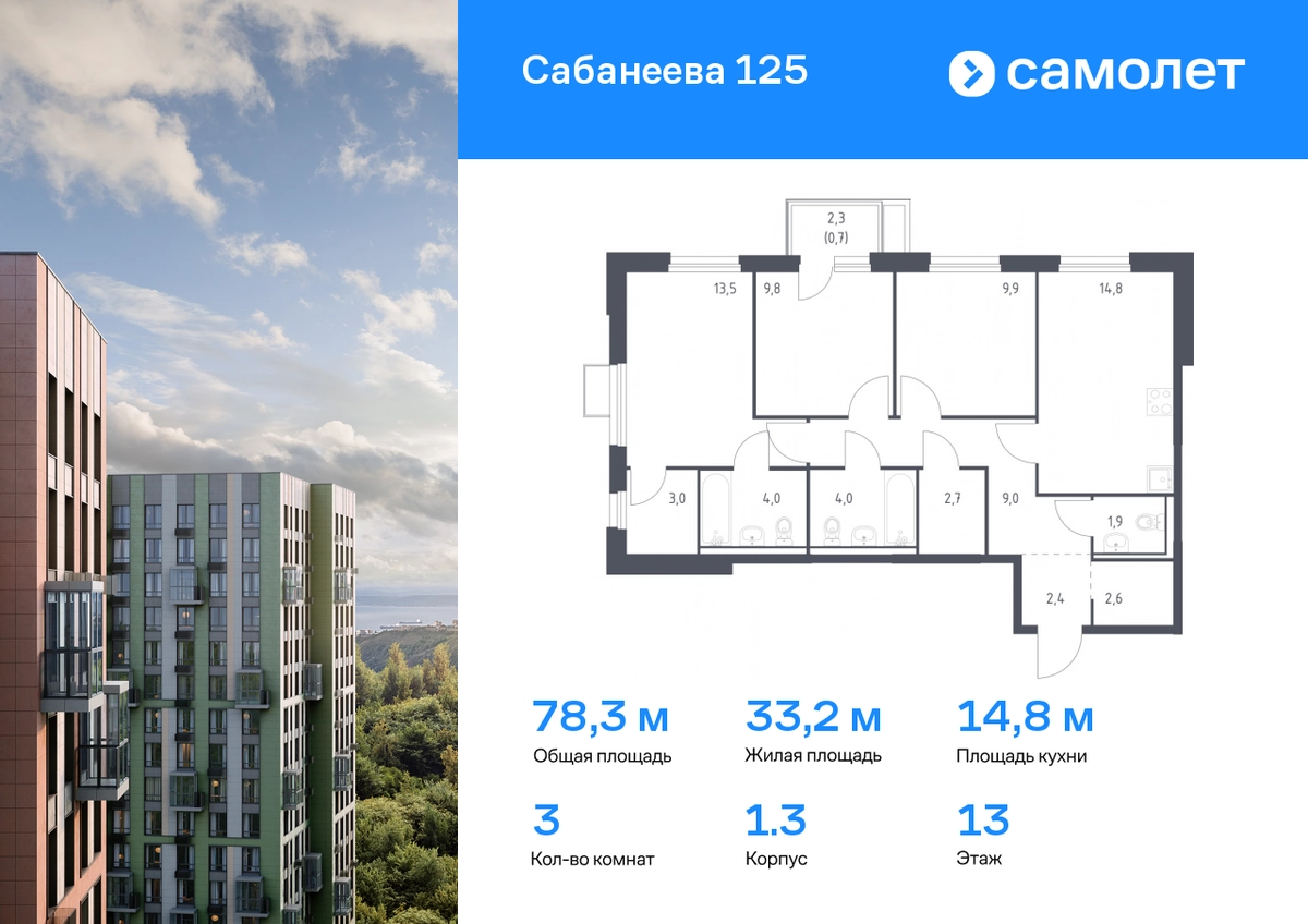 Предлагается 3-комнатная квартира комфорт-класса 78,3 кв.м в корпусе 1.3 на 13 этаже, в ЖК «Сабанеева 125» Квартира без отделки. Доступность опции «отделка» и возможность комплектации мебелью и декором уточняйте у застройщика. Приобрести квартиру возможно по специальным акциям от застройщика, с текущими условиями акций можно ознакомиться в блоке «Акций». Цена динамическая и может отличаться, уточняйте актуальность у застройщика. В жилом комплексе «Сабанеева 125» вы ежедневно будете наслаждаться видами сопок. Холмистый рельеф защищает территорию от ветра. Комплекс расположен в Первореченском районе Владивостока, всего в 20 минутах на машине до центра города. На первых этажах откроются супермаркеты, кафе и пекарни. Для малышей — детский сад в 2 минутах пешком и школа в 10 минутах. За 6 минут можно доехать до Нагорного парка, а за 15 минут — до набережной Цесаревича с панорамой Золотого моста. Комплекс состоит из 3 монолитных домов высотой 25 этажей с фасадами, дизайн которых вдохновлен птицами Дальнего Востока. Дворы оформлены как сад с дальневосточной флорой, есть смотровые площадки, скалодром, перголы и игровые зоны для детей. Подземный паркинг — трехуровневый. В сквозные подъезды без ступеней и с помещением для колясок удобно заходить. В жилом комплексе «Сабанеева 125» есть квартиры с индивидуальными зелеными террасами, увеличенными окнами и панорамными балконами для чаепитий с видом на сопки и залив.#yan19-2r1678652#О застройщике