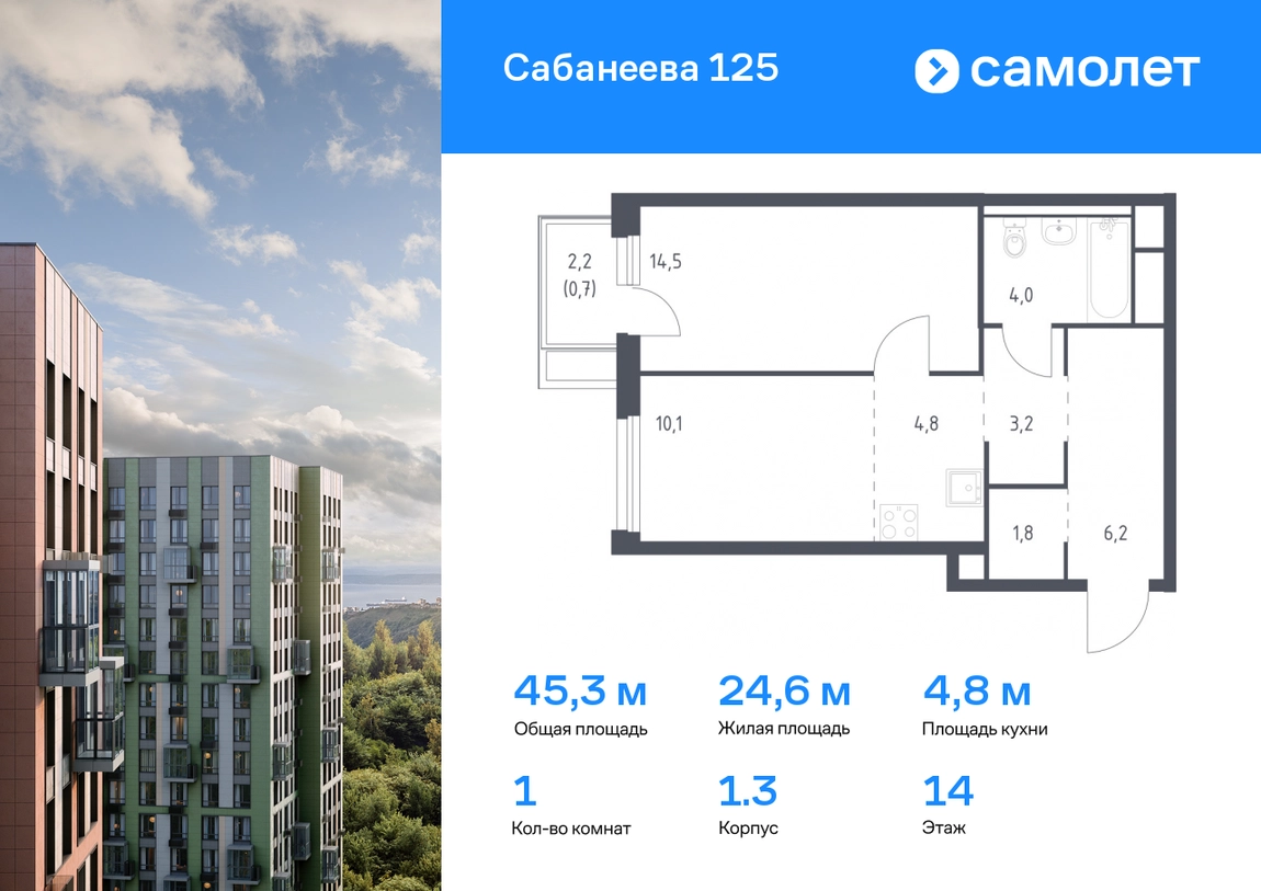 Предлагается 1-комнатная квартира комфорт-класса 45,3 кв.м в корпусе 1.3 на 14 этаже, в ЖК «Сабанеева 125» Квартира без отделки. Доступность опции «отделка» и возможность комплектации мебелью и декором уточняйте у застройщика. Приобрести квартиру возможно по специальным акциям от застройщика, с текущими условиями акций можно ознакомиться в блоке «Акций». Цена динамическая и может отличаться, уточняйте актуальность у застройщика. В жилом комплексе «Сабанеева 125» вы ежедневно будете наслаждаться видами сопок. Холмистый рельеф защищает территорию от ветра. Комплекс расположен в Первореченском районе Владивостока, всего в 20 минутах на машине до центра города. На первых этажах откроются супермаркеты, кафе и пекарни. Для малышей — детский сад в 2 минутах пешком и школа в 10 минутах. За 6 минут можно доехать до Нагорного парка, а за 15 минут — до набережной Цесаревича с панорамой Золотого моста. Комплекс состоит из 3 монолитных домов высотой 25 этажей с фасадами, дизайн которых вдохновлен птицами Дальнего Востока. Дворы оформлены как сад с дальневосточной флорой, есть смотровые площадки, скалодром, перголы и игровые зоны для детей. Подземный паркинг — трехуровневый. В сквозные подъезды без ступеней и с помещением для колясок удобно заходить. В жилом комплексе «Сабанеева 125» есть квартиры с индивидуальными зелеными террасами, увеличенными окнами и панорамными балконами для чаепитий с видом на сопки и залив.#yan19-2r1743707#О застройщике
