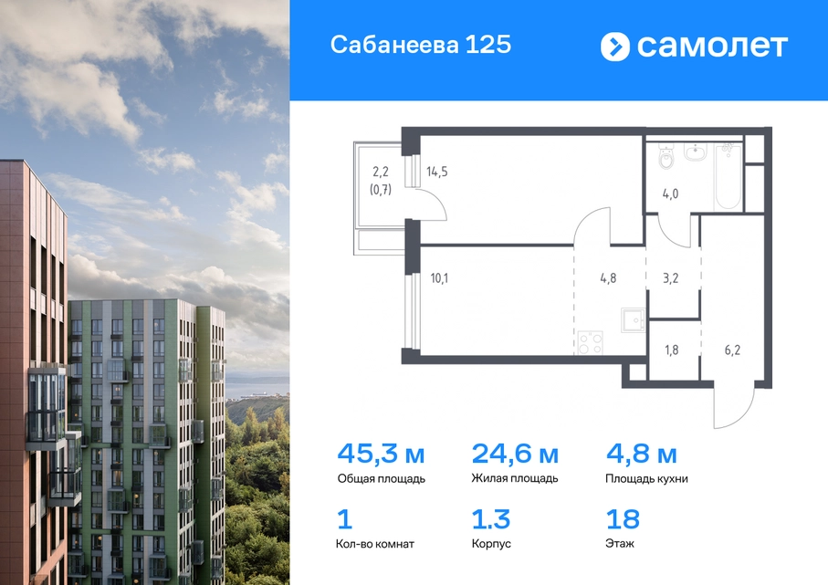 Предлагается 1-комнатная квартира комфорт-класса 45,3 кв.м в корпусе 1.3 на 18 этаже, в ЖК «Сабанеева 125» Квартира без отделки. Доступность опции «отделка» и возможность комплектации мебелью и декором уточняйте у застройщика. Приобрести квартиру возможно по специальным акциям от застройщика, с текущими условиями акций можно ознакомиться в блоке «Акций». Цена динамическая и может отличаться, уточняйте актуальность у застройщика. В жилом комплексе «Сабанеева 125» вы ежедневно будете наслаждаться видами сопок. Холмистый рельеф защищает территорию от ветра. Комплекс расположен в Первореченском районе Владивостока, всего в 20 минутах на машине до центра города. На первых этажах откроются супермаркеты, кафе и пекарни. Для малышей — детский сад в 2 минутах пешком и школа в 10 минутах. За 6 минут можно доехать до Нагорного парка, а за 15 минут — до набережной Цесаревича с панорамой Золотого моста. Комплекс состоит из 3 монолитных домов высотой 25 этажей с фасадами, дизайн которых вдохновлен птицами Дальнего Востока. Дворы оформлены как сад с дальневосточной флорой, есть смотровые площадки, скалодром, перголы и игровые зоны для детей. Подземный паркинг — трехуровневый. В сквозные подъезды без ступеней и с помещением для колясок удобно заходить. В жилом комплексе «Сабанеева 125» есть квартиры с индивидуальными зелеными террасами, увеличенными окнами и панорамными балконами для чаепитий с видом на сопки и залив.#yan19-2r1743709#О застройщике