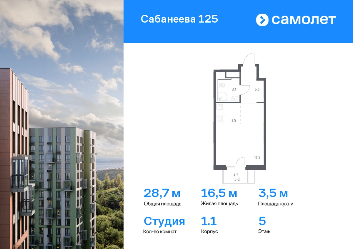 Строим кварталы для жизни с заботой о будущем. Предлагается квартира студия комфорт-класса 28,7 кв.м в корпусе 1.1 на 5 этаже, в ЖК «Сабанеева 125» Квартира без отделки. Доступность опции «отделка» и возможность комплектации мебелью и декором уточняйте у застройщика. Приобрести квартиру возможно по специальным акциям от застройщика, с текущими условиями акций можно ознакомиться в блоке «Акций». Цена динамическая и может отличаться, уточняйте актуальность у застройщика. В жилом комплексе «Сабанеева 125» вы ежедневно будете наслаждаться видами сопок. Холмистый рельеф защищает территорию от ветра. Комплекс расположен в Первореченском районе Владивостока, всего в 20 минутах на машине до центра города. На первых этажах откроются супермаркеты, кафе и пекарни. Для малышей — детский сад в 2 минутах пешком и школа в 10 минутах. За 6 минут можно доехать до Нагорного парка, а за 15 минут — до набережной Цесаревича с панорамой Золотого моста. Комплекс состоит из 3 монолитных домов высотой 25 этажей с фасадами, дизайн которых вдохновлен птицами Дальнего Востока. Дворы оформлены как сад с дальневосточной флорой, есть смотровые площадки, скалодром, перголы и игровые зоны для детей. Подземный паркинг — трехуровневый. В сквозные подъезды без ступеней и с помещением для колясок удобно заходить. В жилом комплексе «Сабанеева 125» есть квартиры с индивидуальными зелеными террасами, увеличенными окнами и панорамными балконами для чаепитий с видом на сопки и залив.#yan19-2r1750419#О застройщике